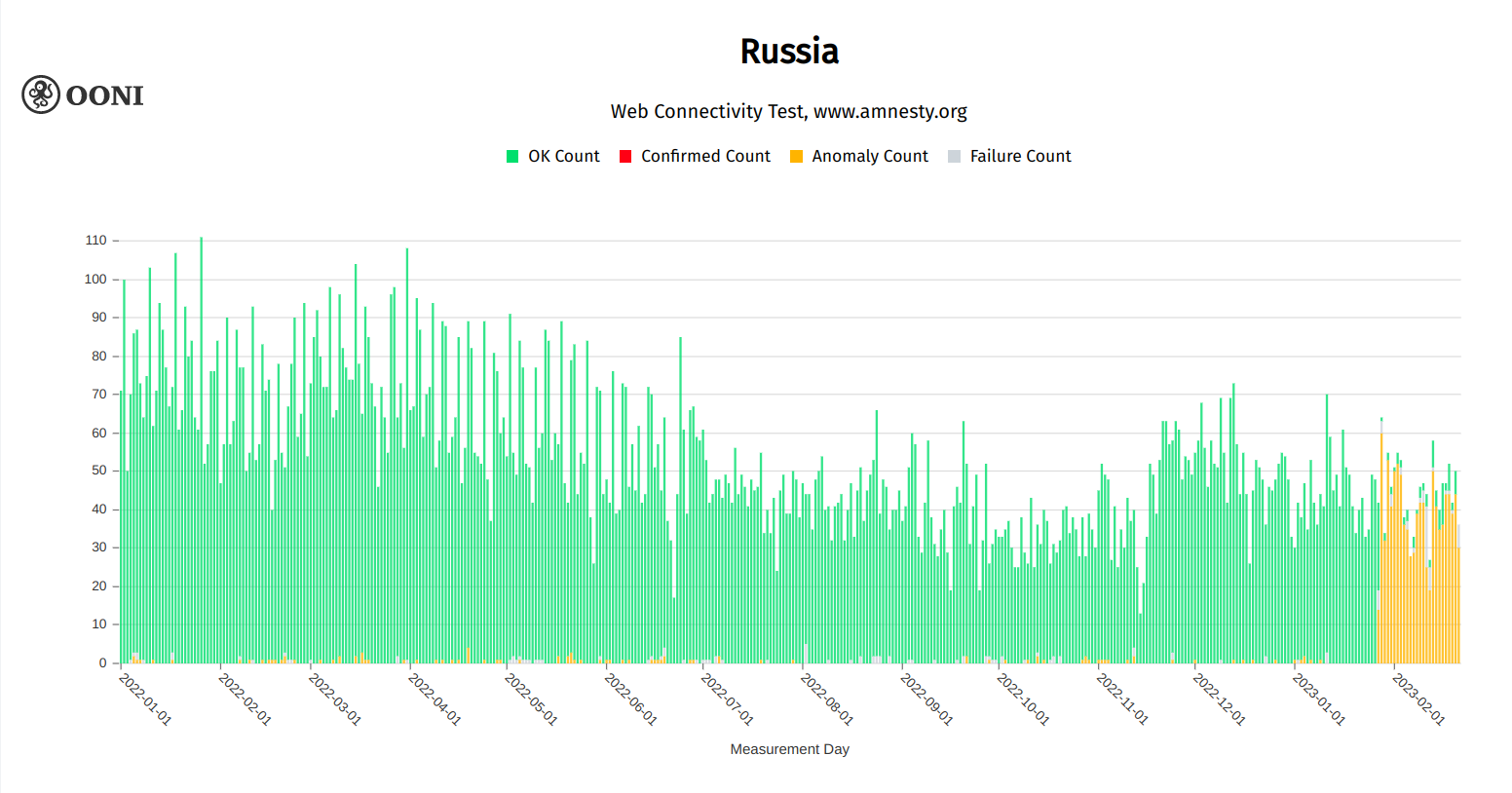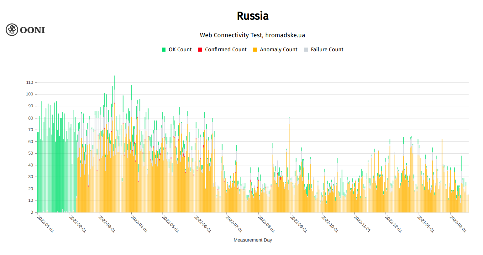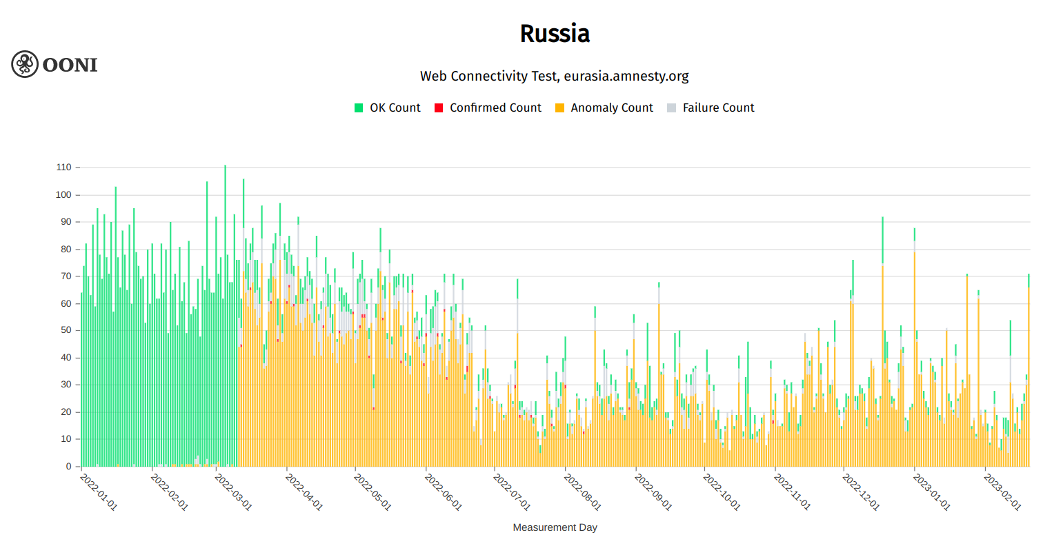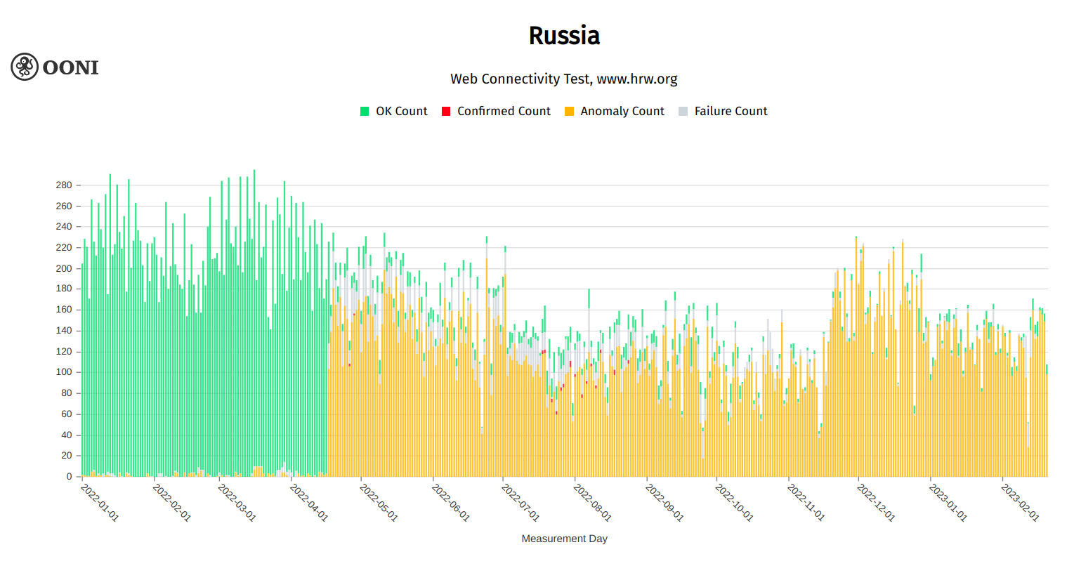 In this report, we attempt to answer this question through the analysis of OONI measurements collected from Russia between January 2022 to February 2023. We supplement our findings with information from relevant legal analysis and desk research provided by Roskomsvoboda.