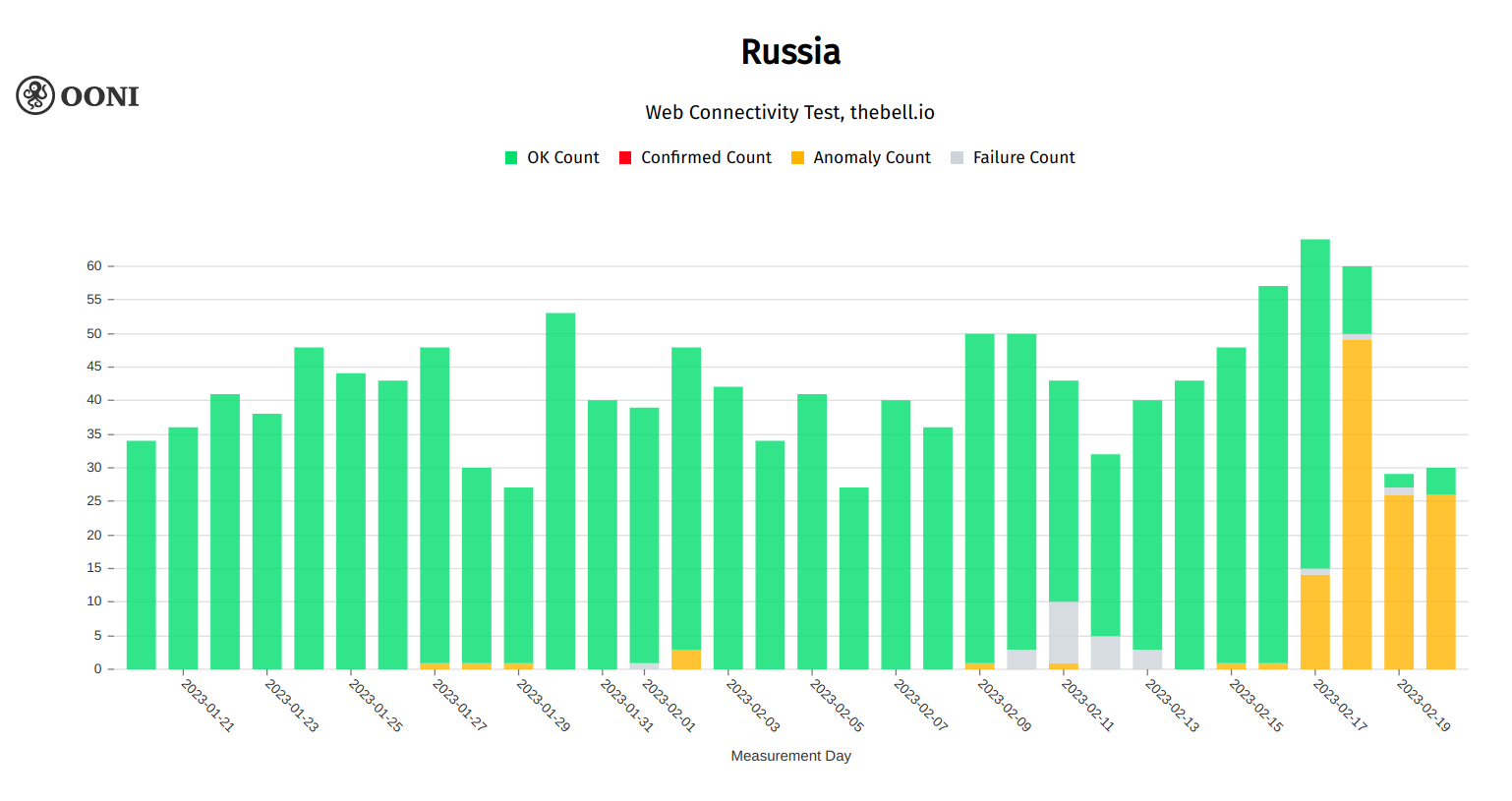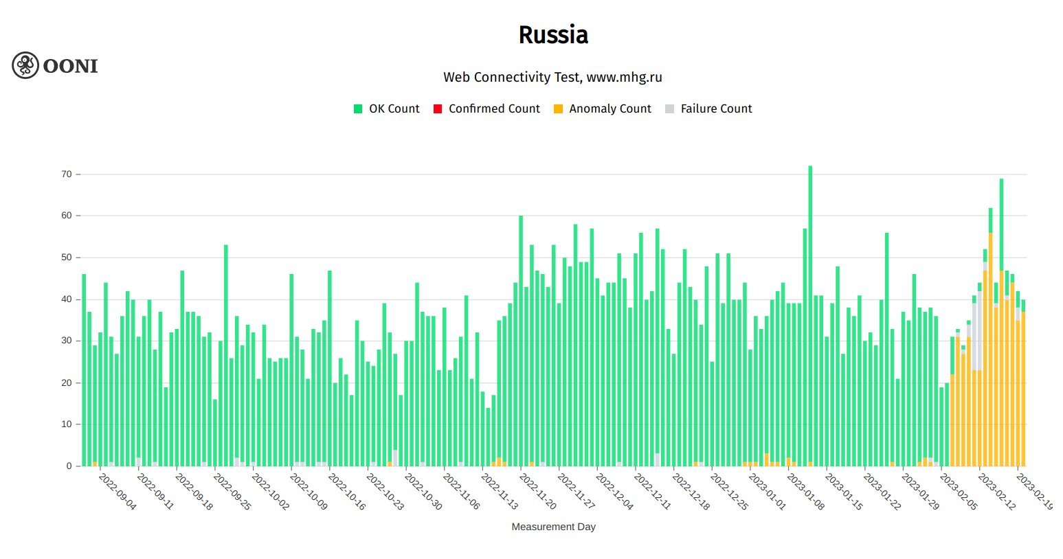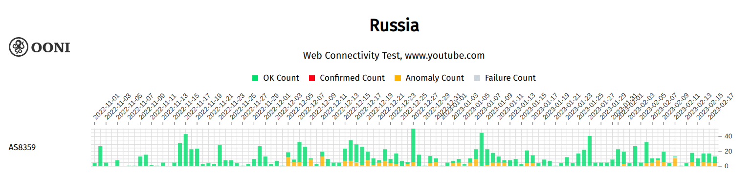 ) on AS8359 in Russia between 1st November 2022 to 19th February 2023 (source: OONI data).