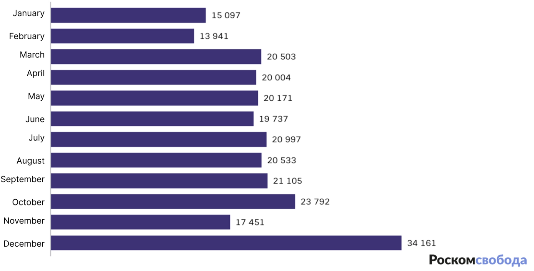 Chart: New entries added to the registry of prohibited websites maintained by Roskomnadzor in 2022 (distributed by months).