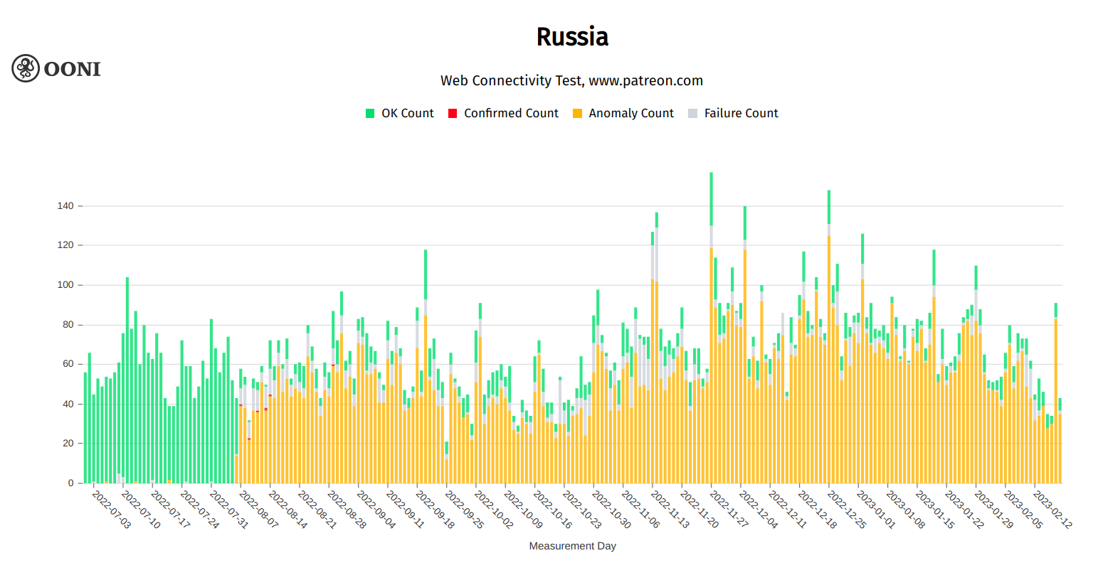 ) was added to Roskomnadzor’s blocking registry. On 10th August 2022, Patreon published a statement on the restriction of their platform in Russia. Patreon specified that they were notified of the block by Russia’s internet regulator, who demanded that they remove a Russian creator and their content (which condemns the invasion of Ukraine). As a result of non-compliance, access to Patreon was reportedly blocked in Russia, and this is corroborated by OONI data.
