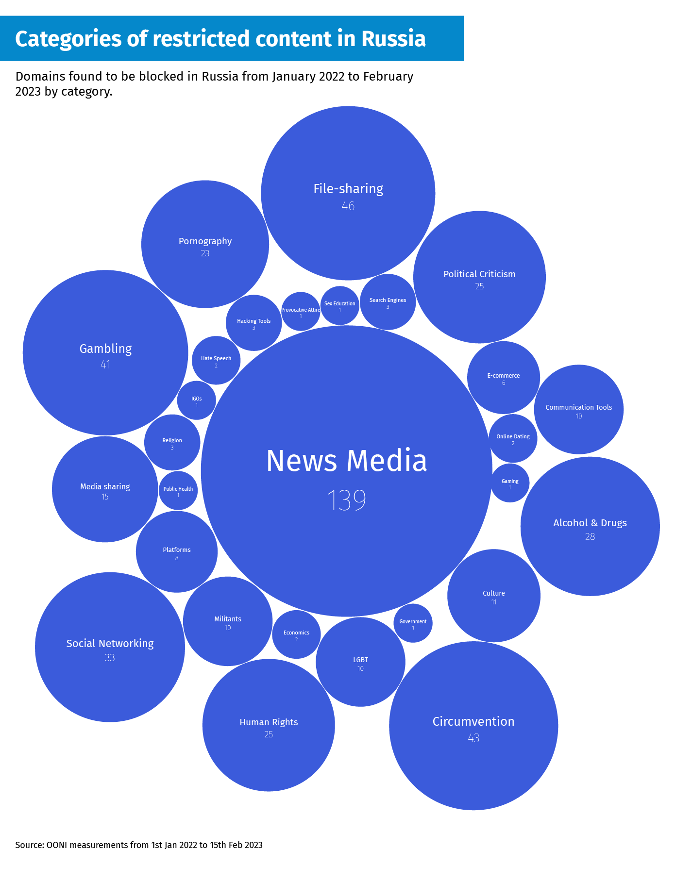 Chart: Number and category of domains confirmed blocked based on OONI data (between January 2022 to February 2023), but which are not included in Russia’s official blocking registry.