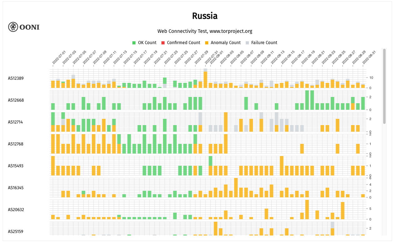 on 358 ASNs in Russia between 1st January 2022 to 31st December 2022. While the vast majority of measurements throughout the testing period are anomalous (providing a strong signal of blocking), most measurements were successful between 15th to 28th July 2022, suggesting that access to www.torproject.org