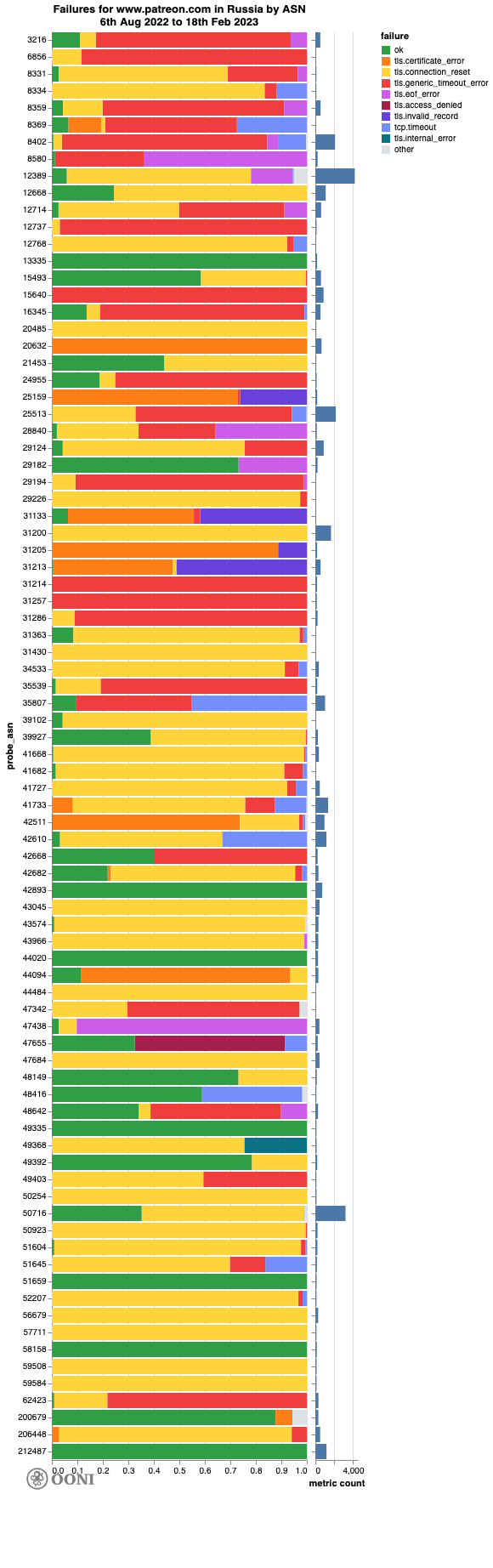 was previously accessible on all tested networks, it started to present a large volume of anomalies on 6th August 2022. These anomalies have persisted to date (with most measurements from almost all tested networks resulting in anomalies), providing a strong signal of blocking. By analyzing the anomalous data, we can see that ISPs in Russia blocked access to Patreon using a variety of different censorship techniques. The following chart provides a breakdown of the specific failures observed on tested ASNs.