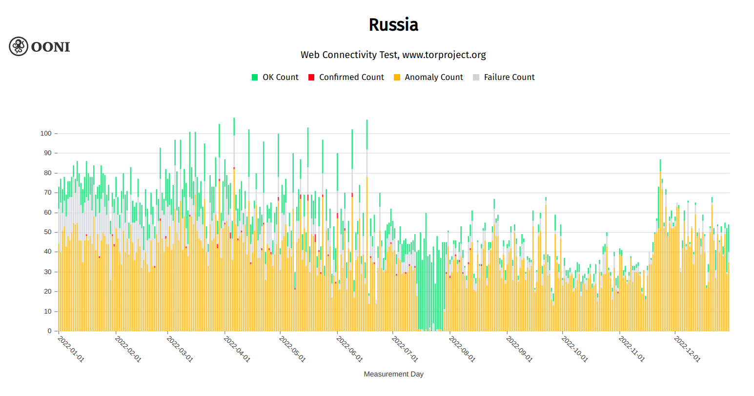 In early December 2021, Russia started blocking access to Tor, which provides free software for online privacy, anonymity, and censorship circumvention. At the time, OONI published a report documenting the blocking of the Tor anonymity network (which started on 1st December 2021) and the blocking of the Tor Project website (which started on 7th December 2021) in Russia.