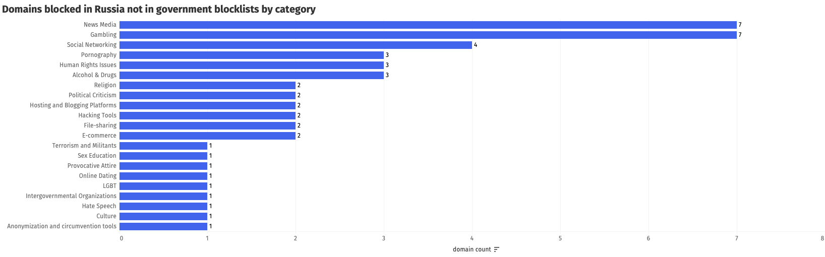 Through the following chart, we provide a breakdown of the domains (categorized based on the standardized Citizen Lab category codes) confirmed blocked through OONI data, but which are not included in Russia’s blocking registry.