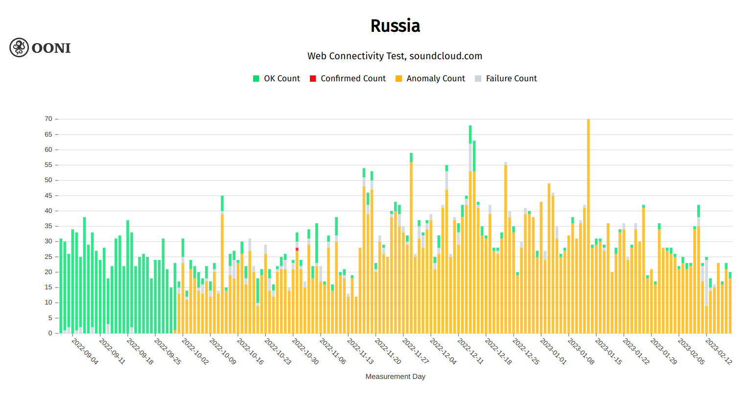 Starting from 1st October 2022, OONI data shows the blocking of SoundCloud in Russia.