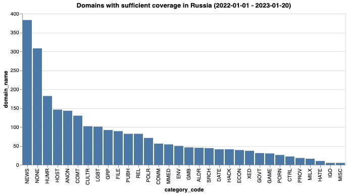 Our analysis of OONI Web Connectivity measurements collected from Russia between January 2022 to February 2023 shows the blocking of 494 domains, 48 of which do not appear to be included in Roskomnadzor’s official blocking registry. Overall, the blocked domains fall under a wide range of 28 different categories, suggesting pervasive levels of internet censorship in Russia.