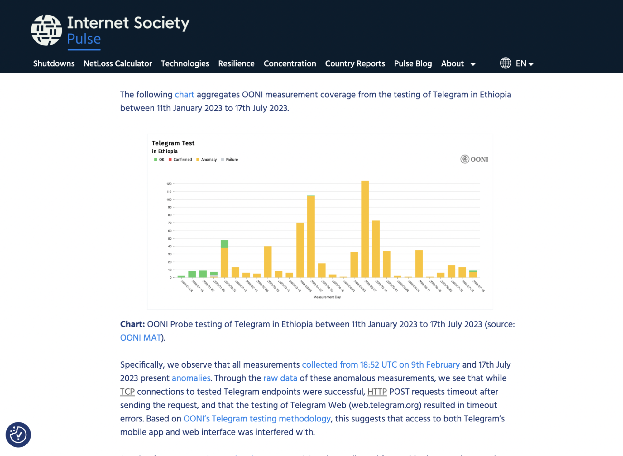 - Access Now’s press release on social media blocks in Ethiopia. In March 2023, Access Now published a press release urging Ethiopian authorities to stop blocking access to social media platforms. As part of this press release, they cite OONI measurements on the blocking of social media platforms in Ethiopia.