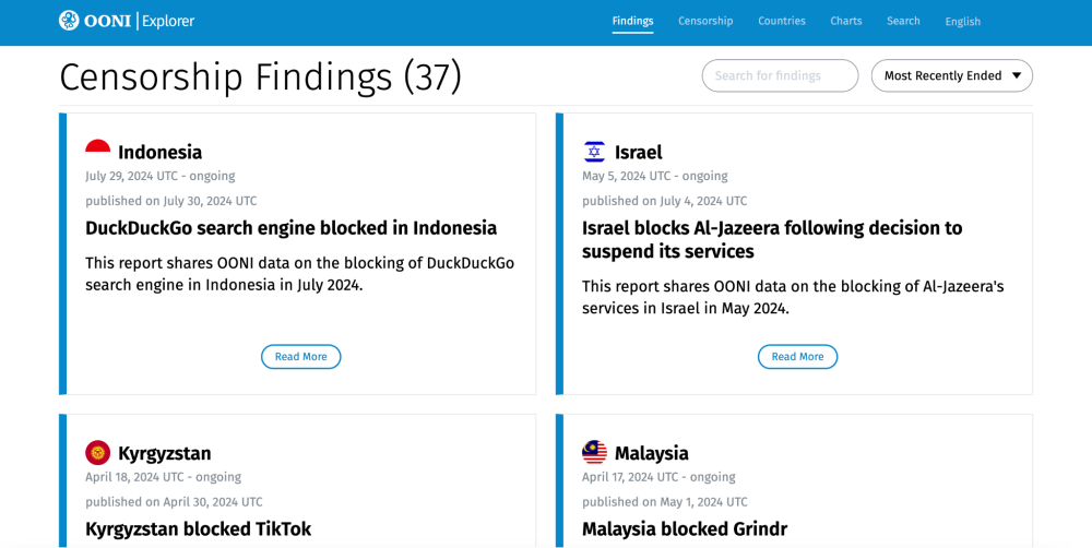 In response to emergent censorship events, we will continue to publish new reports on the OONI Explorer Censorship Findings page on an ongoing basis.