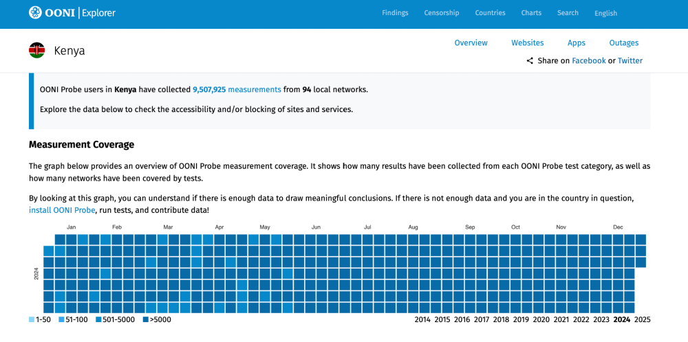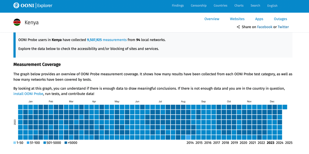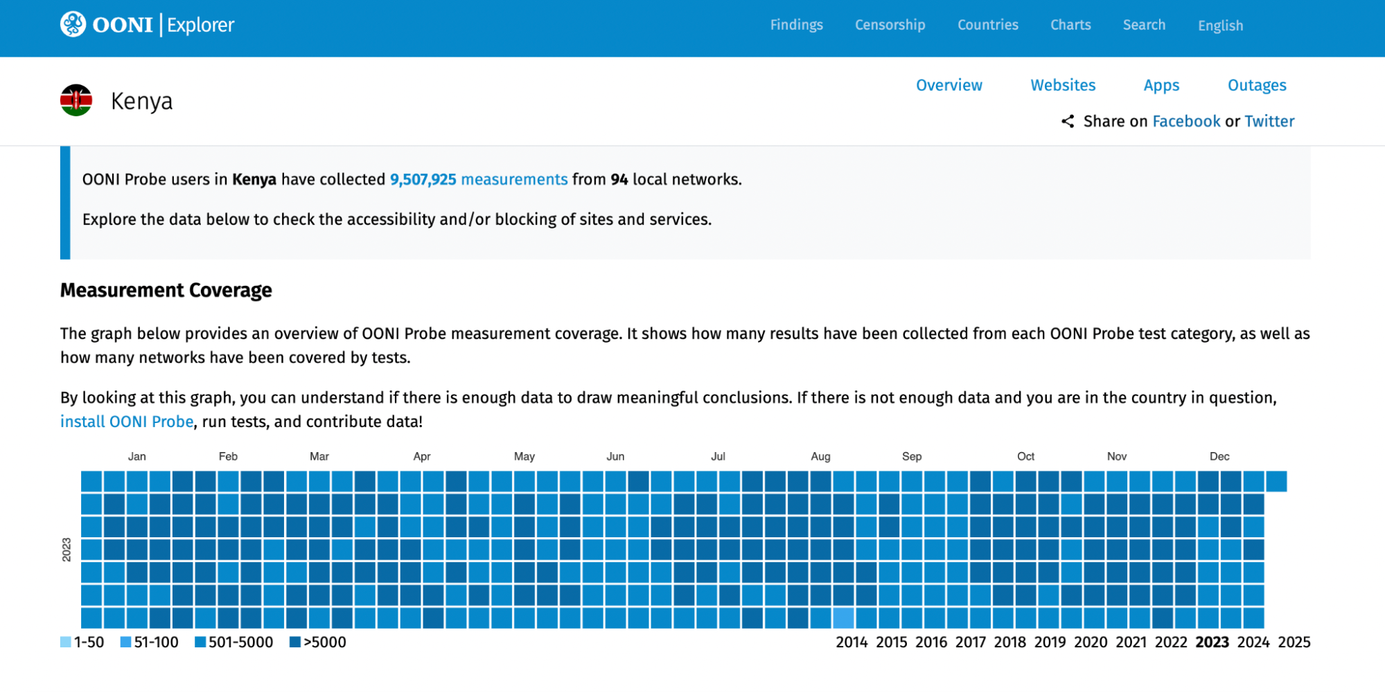 - Measurement coverage. The availability of OONI data depends on whether, on which networks, and when an OONI Probe user ran tests in Kenya. As OONI Probe is used on a voluntary basis, OONI has no control over the availability measurements. As a result, OONI measurement coverage in Kenya varies over time.