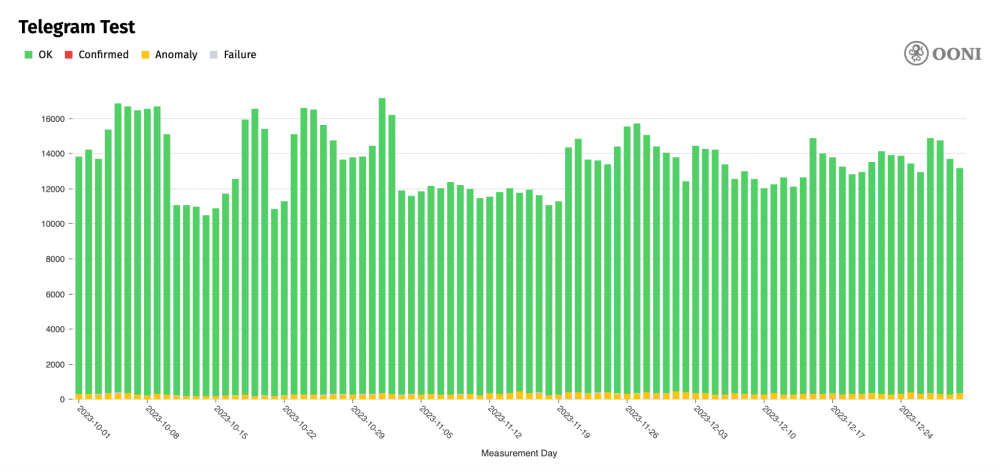 Chart: Global OONI Probe testing of Telegram between 1st October 2023 to 31st December 2023 (source: OONI data).