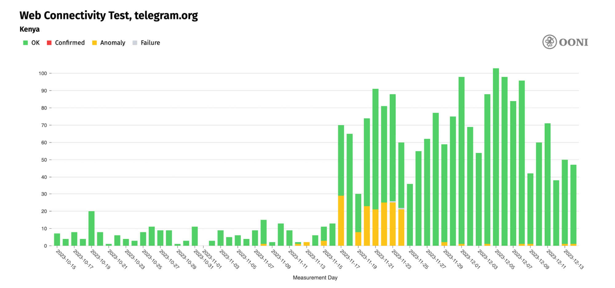 In November 2023, OONI data presented signs of Telegram blocking in Kenya for the first time. Even though OONI data has been collected from Kenya since 2016, the data had not shown strong signals pertaining to the blocking of social media or instant messaging apps in the country before. In fact, OONI even published a report in the past documenting that they had found almost no signs of Internet censorship in Kenya.