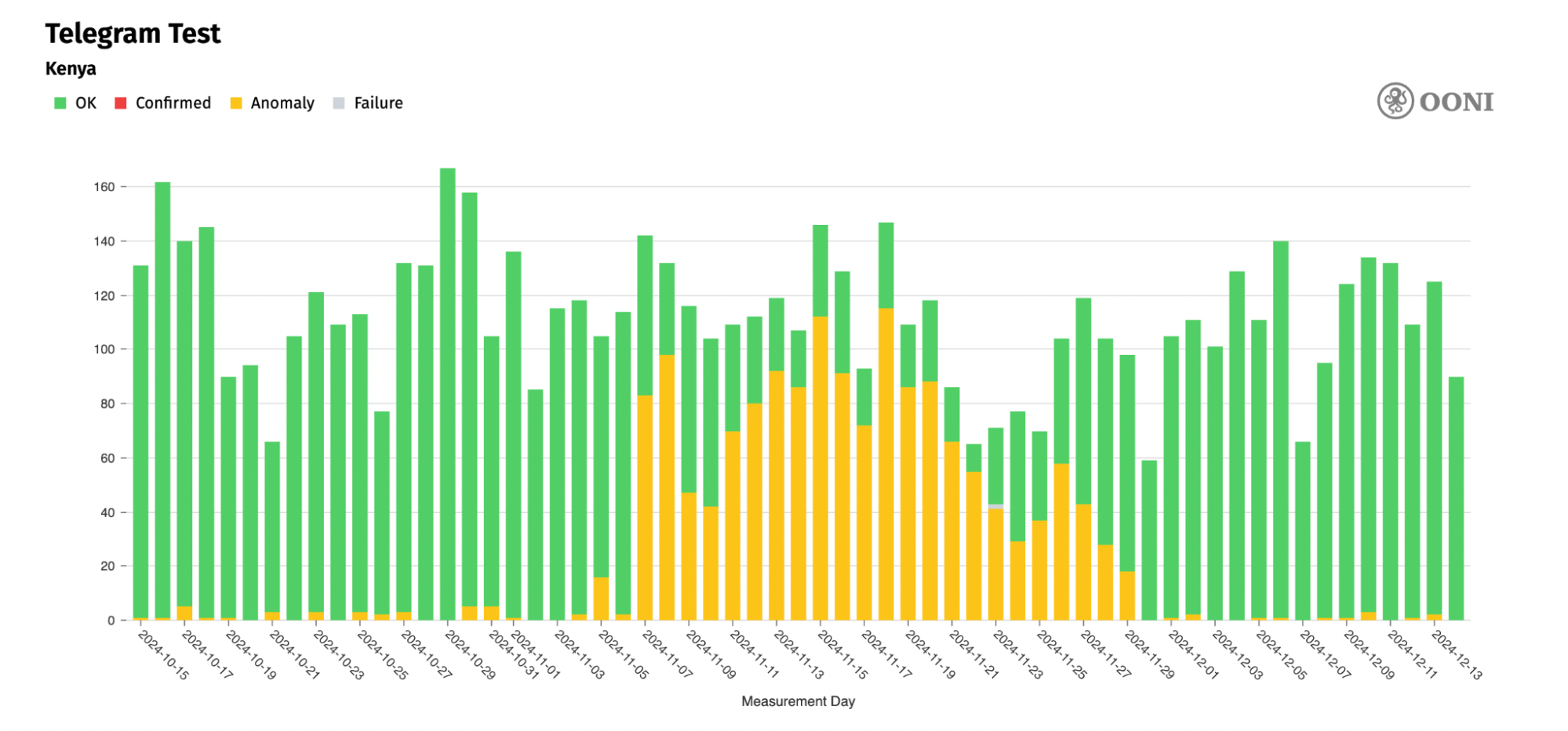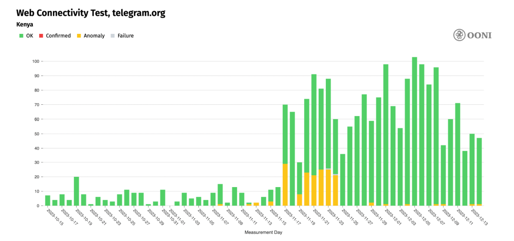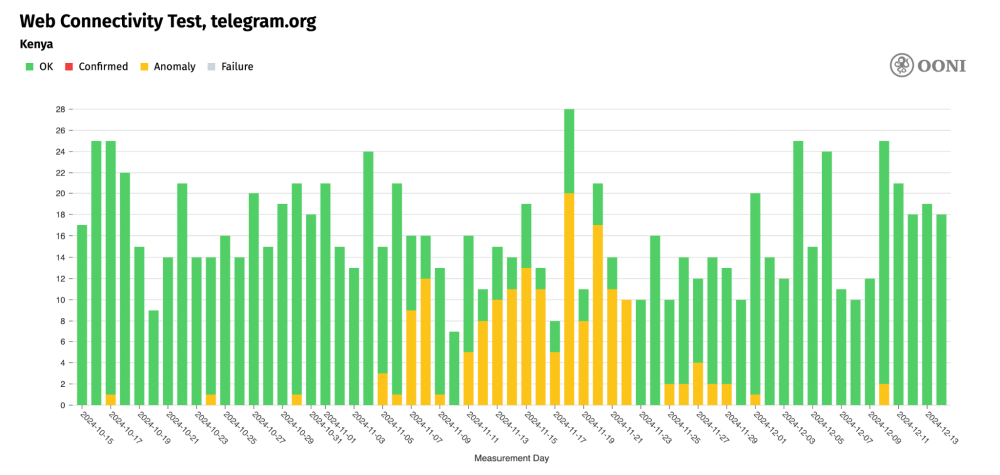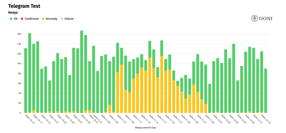 A similar pattern is observed when looking at OONI measurements collected from the OONI Probe Telegram experiment on multiple networks in Kenya during the same period (15th October 2024 to 15th December 2024), as illustrated below.