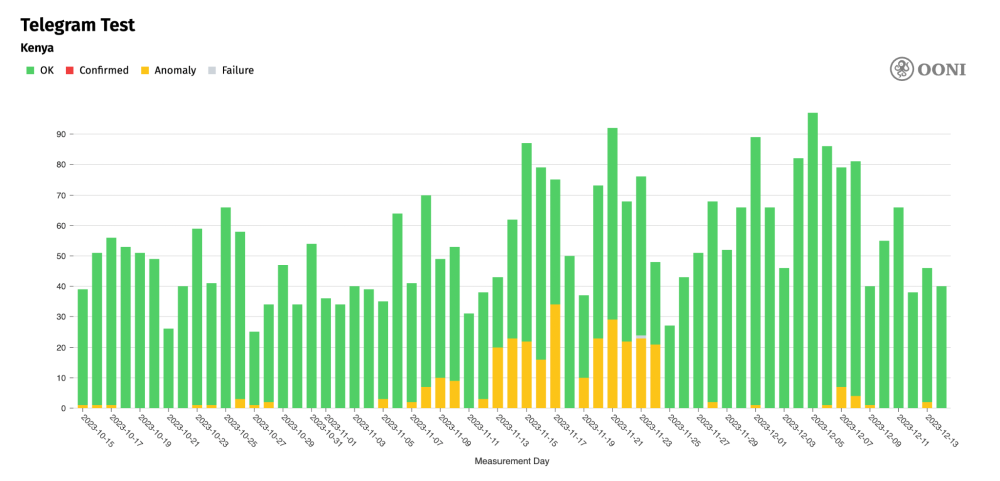 A similar pattern is observed when looking at OONI measurements collected from the OONI Probe Telegram experiment on multiple networks in Kenya during the same period (15th October 2023 to 15th December 2023), as illustrated below.