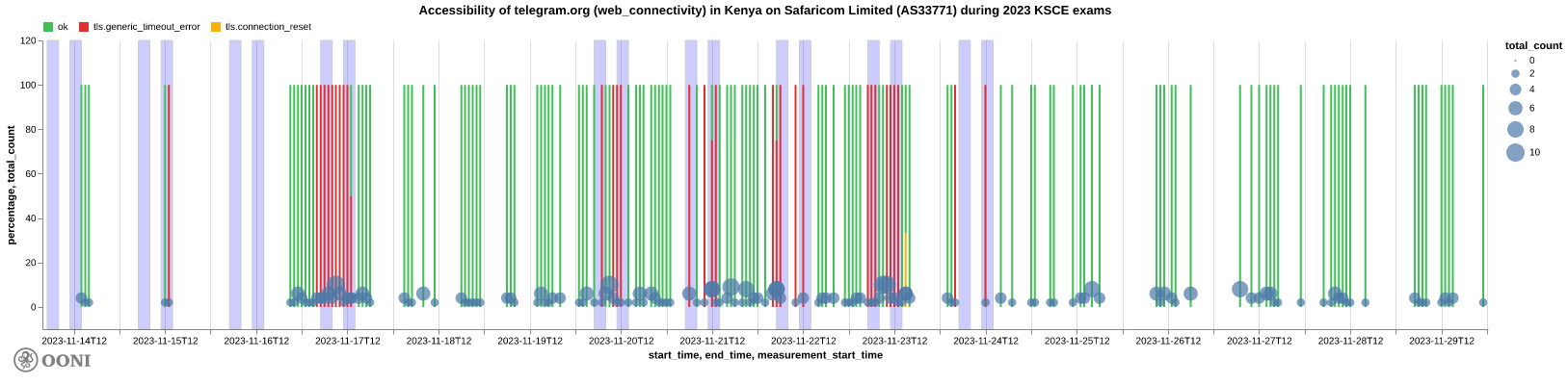 Chart: Analysis of OONI Probe Telegram measurements on Safaricom (AS33771) in Kenya during the 2023 KCSE exam period, demonstrating the TLS level blocking of Telegram Web (source: OONI data).