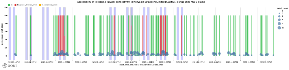 Chart: Analysis of OONI Probe Web Connectivity testing of telegram.org on Safaricom (AS33771) in Kenya during the 2023 KCSE exam period (source: OONI data).