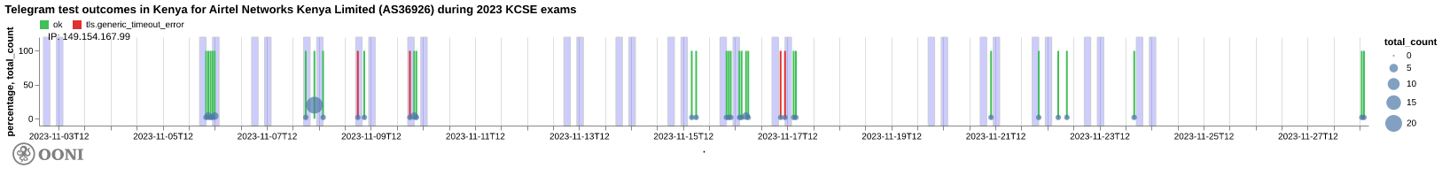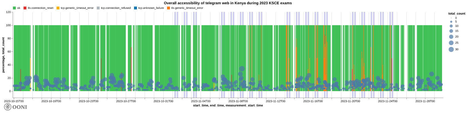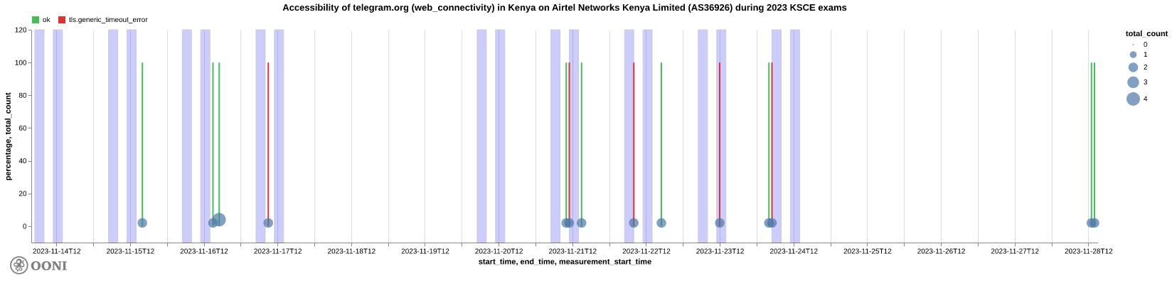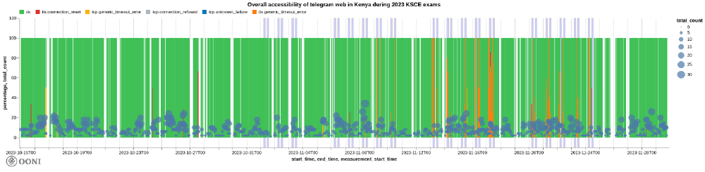 Chart: Analysis of OONI Probe Telegram measurements on Airtel (AS36926) in Kenya during the 2023 KCSE exam period, demonstrating the TLS level blocking of Telegram Web (source: OONI data).