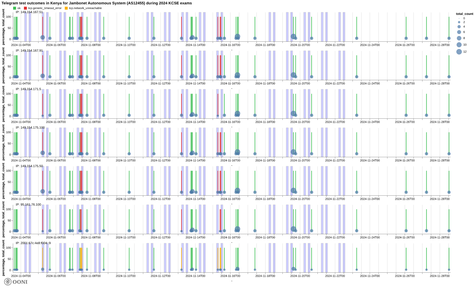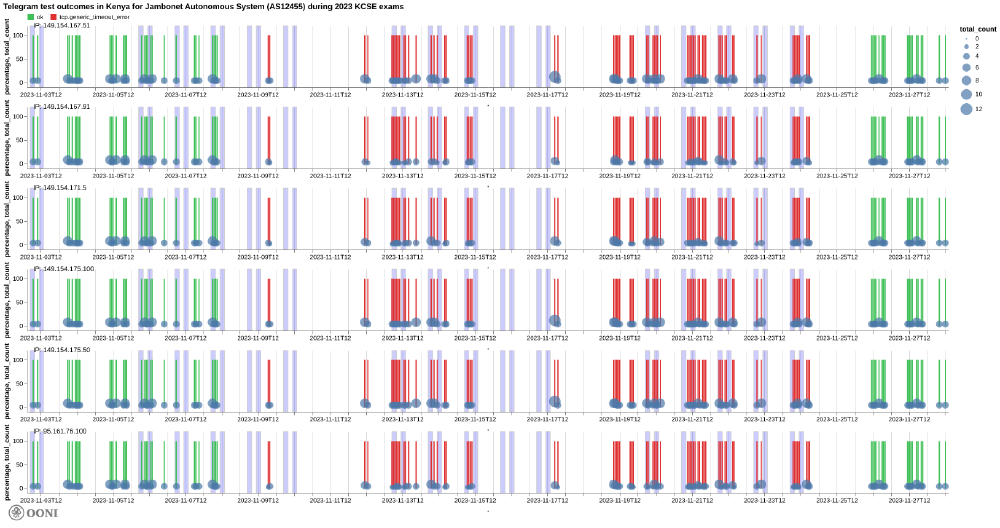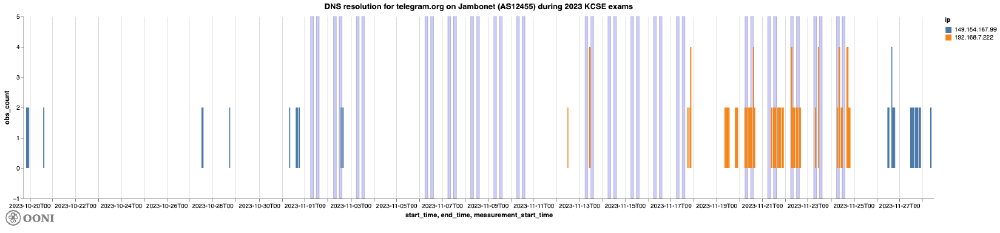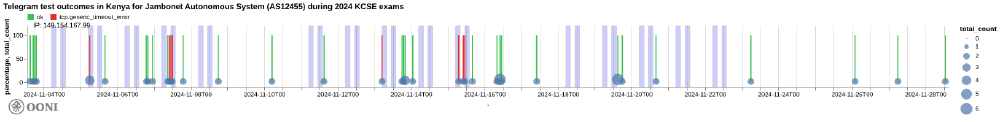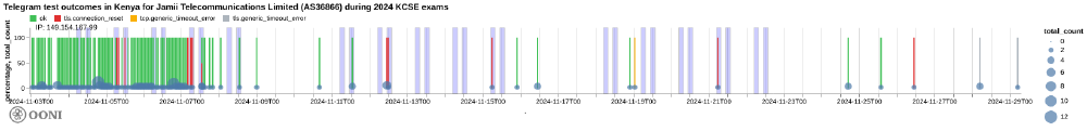 Chart: Analysis of OONI Probe Telegram measurements on Jambonet (AS12455) in Kenya during the 2024 KCSE exam period, demonstrating IP level blocking of Telegram Web (source: OONI data).