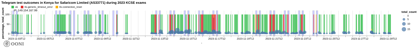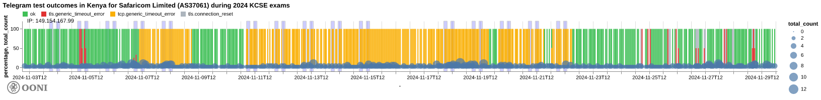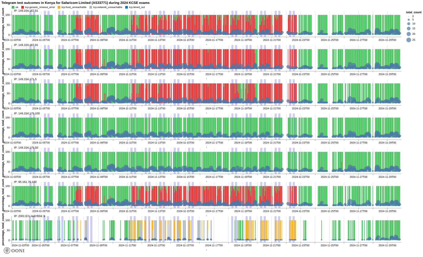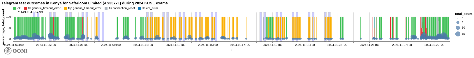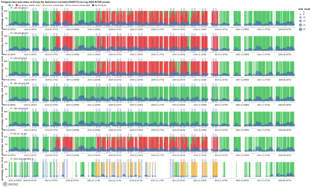 Chart: Analysis of OONI Probe Telegram measurements on Safaricom (AS33771) in Kenya during the 2024 KCSE exam period, demonstrating IP level blocking of Telegram Web (source: OONI data).