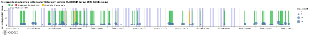 Between 8th to 24th November 2023 (which correlates with the dates of the 2023 KCSE exams), OONI data shows that access to Telegram was intermittently blocked on Safaricom (AS33771 and AS37061) and Airtel (AS36926), and persistently blocked on Jambonet (AS12455).