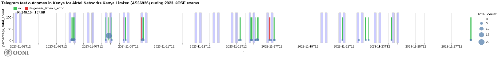 Chart: Analysis of OONI Probe Web Connectivity testing of telegram.org on Airtel (AS36926) in Kenya during the 2023 KCSE exam period (source: OONI data).