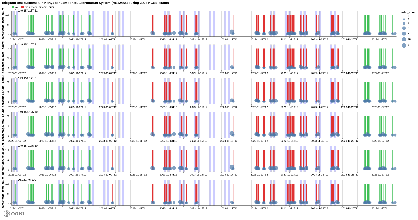 IP level blocks on Jambonet. Of all tested networks, OONI data shows that only Jambonet (AS12455) seems to have implemented IP level blocking of Telegram endpoints. On this network, all tested Telegram endpoints consistently presented timeout errors between 8th November 2023 to 24th November 2023. Similarly to the blocking of telegram.org, OONI data shows that Jambonet continued to block access to Telegram endpoints outside of the time period of the 2023 KCSE national exams (such as during the weekend and outside of exam hours).