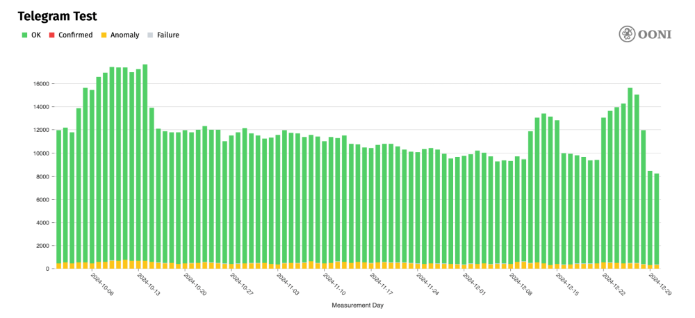 Chart: Global OONI Probe testing of Telegram between 1st October 2024 to 31st December 2024 (source: OONI data).