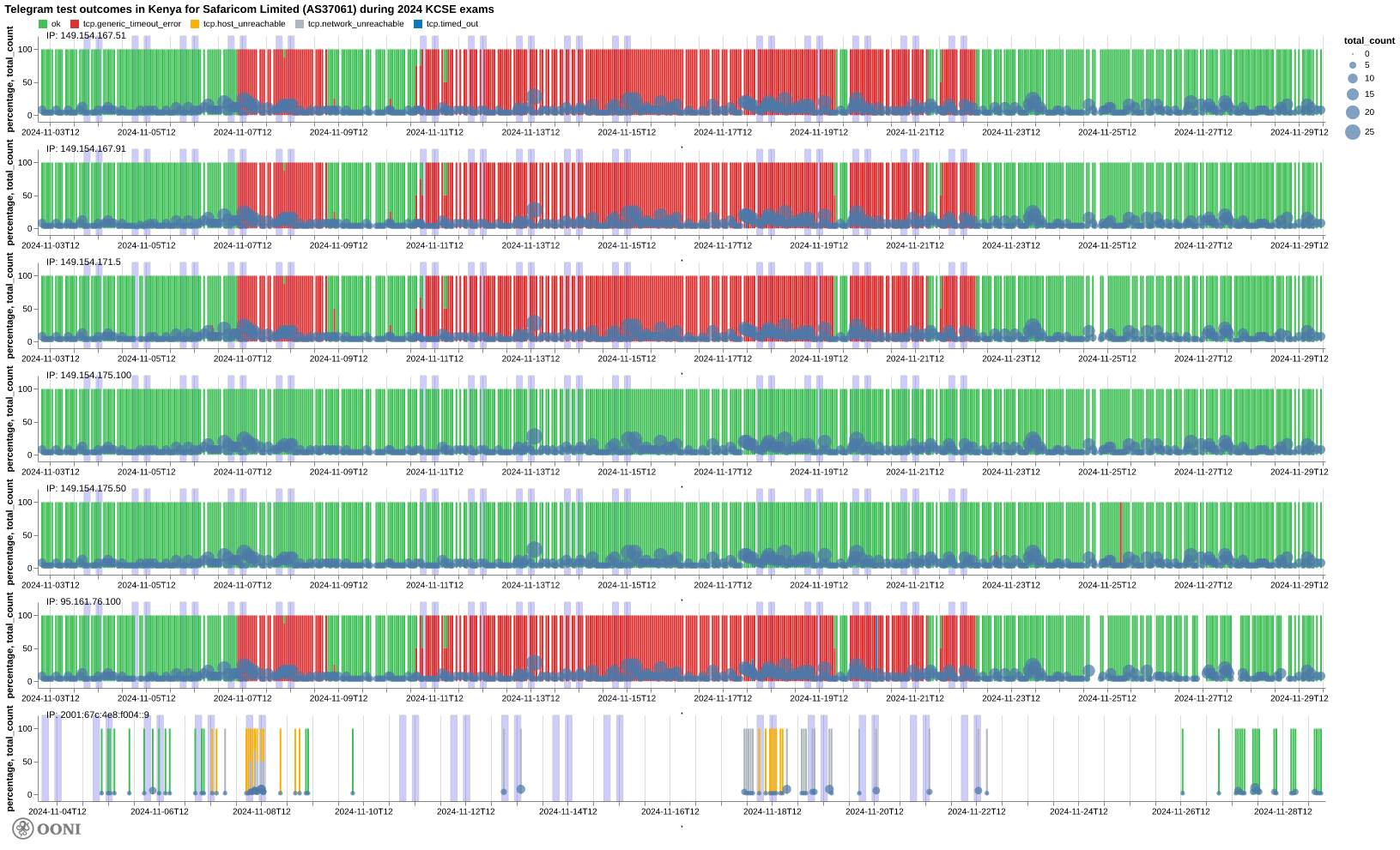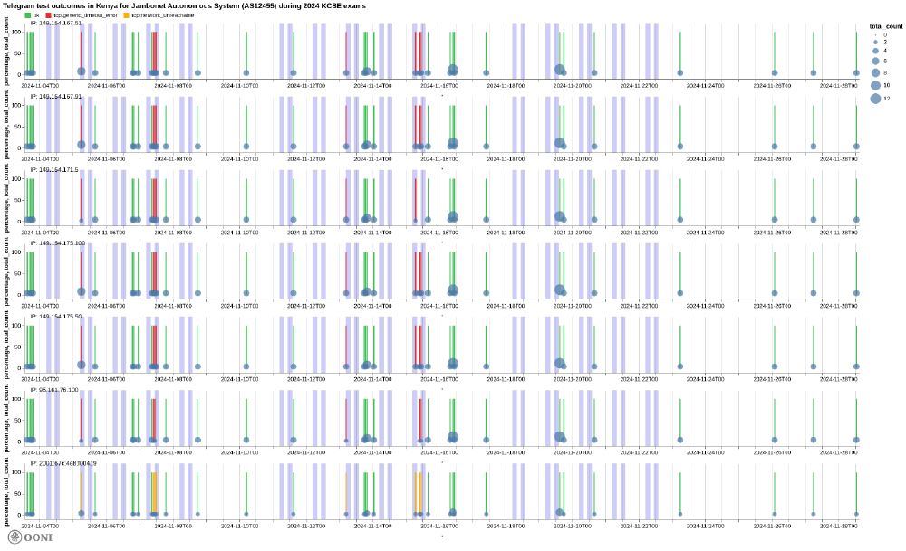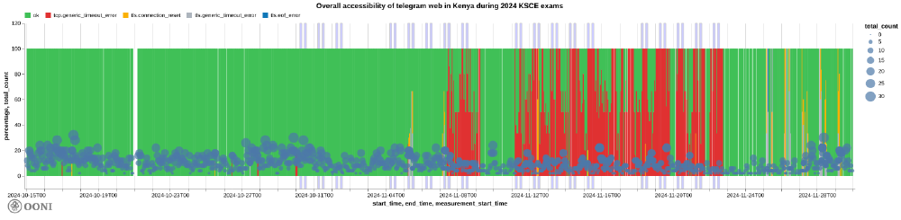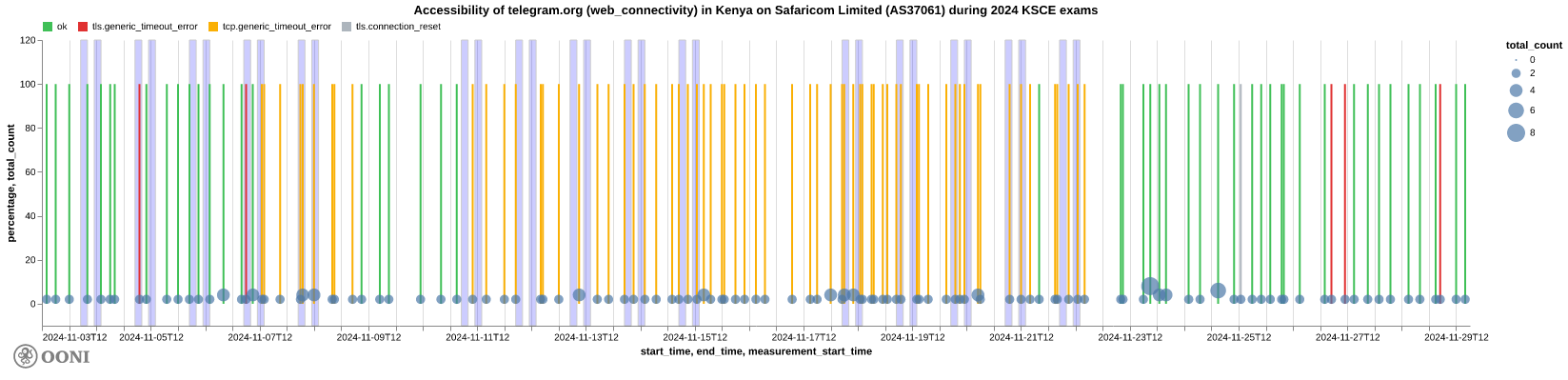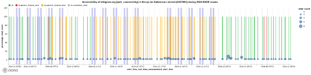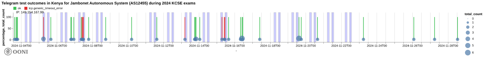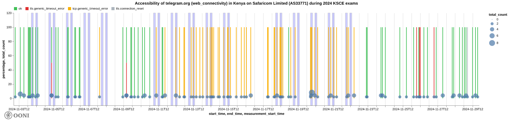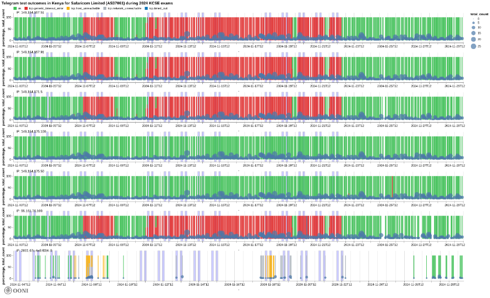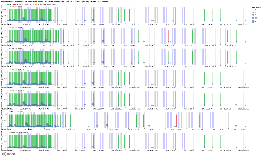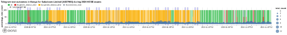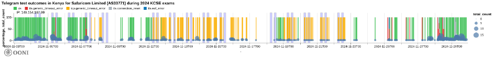 Between 7th to 22nd November 2024, OONI data shows that access to Telegram app endpoints was blocked on the Jambonet (AS12455) and Safaricom (AS33771 and AS37061) networks. On Jambonet (AS12455), OONI data shows that all tested Telegram endpoints were blocked, and that the block was limited to exam hours. On Safaricom networks (AS33771 and AS37061), OONI data shows the blocking of most Telegram endpoints, except for two (149.154.175.100 and 149.154.175.50), and that the block persisted outside of the hours of the national exams. While the blocking of Telegram app endpoints was lifted by 23rd November 2024 (at the end of the 2024 KCSE exams, as instructed by the Communications Authority of Kenya), OONI data suggests that access to Telegram Web (web.telegram.org) remained blocked on Safaricom networks (AS33771 and AS37061) until 29th November 2024.