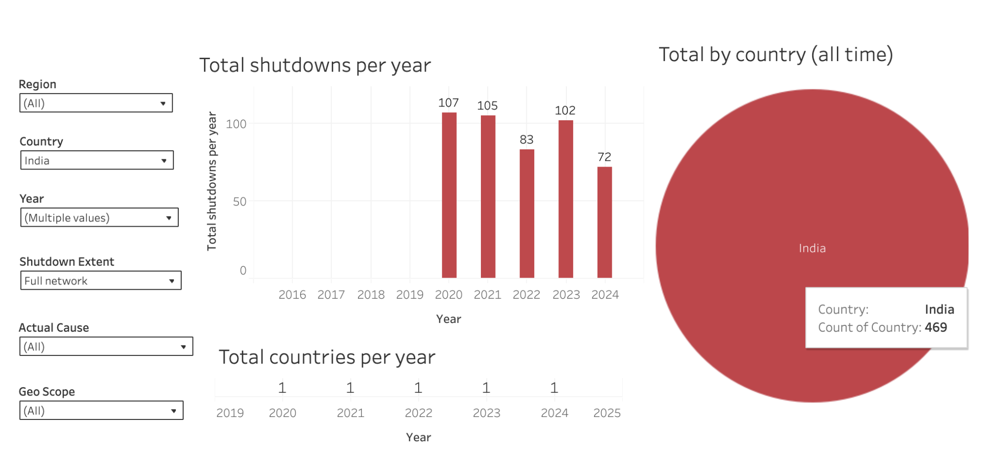 In the past years, India has been an international leader in the number of internet outages documented in different regions of the country. According to the KeepItOn STOP dataset, India experienced more than 450 localised internet outages between 2020 to 2025. The regions of Manipur and Jammu and Kashmir experienced the longest outages, lasting more than 200 days in 2023 and 2020, respectively.