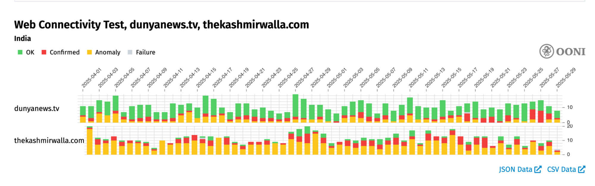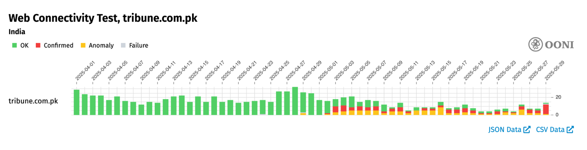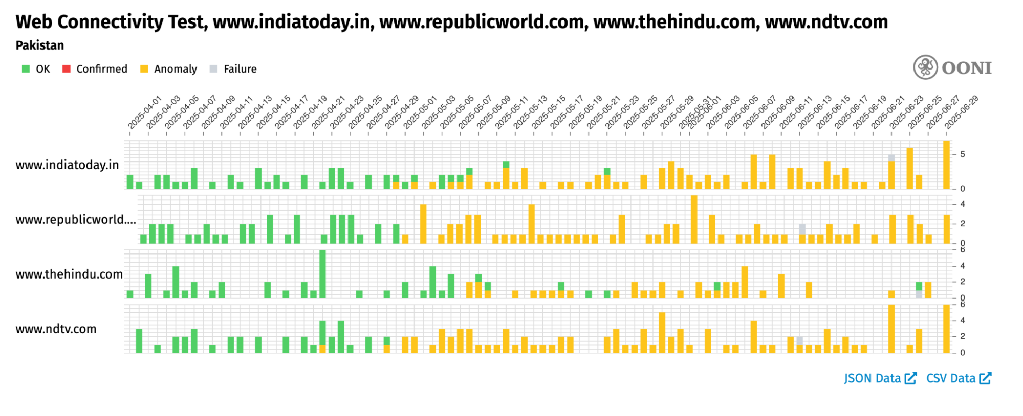 In May 2025, during and after the 4-day military conflict between India and Pakistan that emerged following the Pahalgam terrorist attack, 30 news media websites were reported to be inaccessible by users in Pakistan and India. OONI data suggests that among the reported websites, at least 12 websites of Pakistani and Indian news media outlets were blocked in India, and at least 8 Indian news media websites were blocked on some networks in Pakistan. Most of these blocks remain ongoing after the end of the conflict and remain inaccessible on the date of publication of this report.
