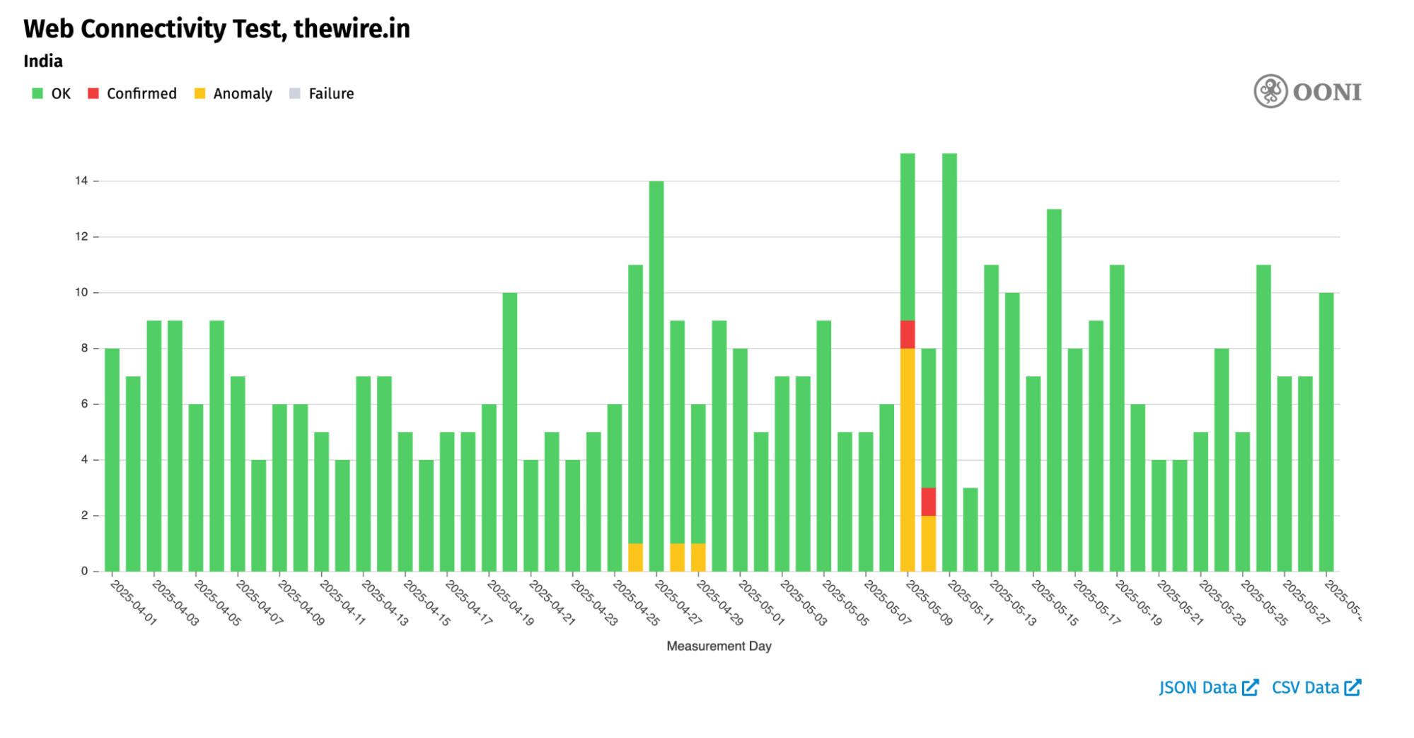 ) were accessible after 19th May 2025, we do not have data confirming their accessibility before this date, and it is possible to speculate that the blocks were lifted before OONI Probe users started testing these domains for censorship in India.