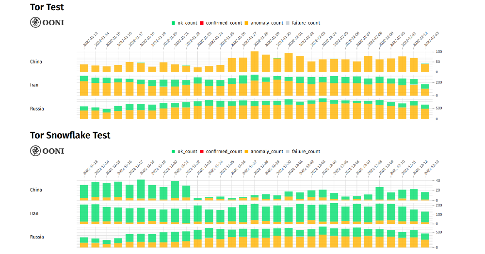 In 2022, we launched a new Circumvention Tool Reachability Dashboard! This tool provides charts with aggregate views of real-time OONI data from the reachability testing of Psiphon, Tor, and Tor Snowflake. Through this platform, you can easily discover whether these circumvention tools work around the world, or whether they’re presenting signs of potential blocking.