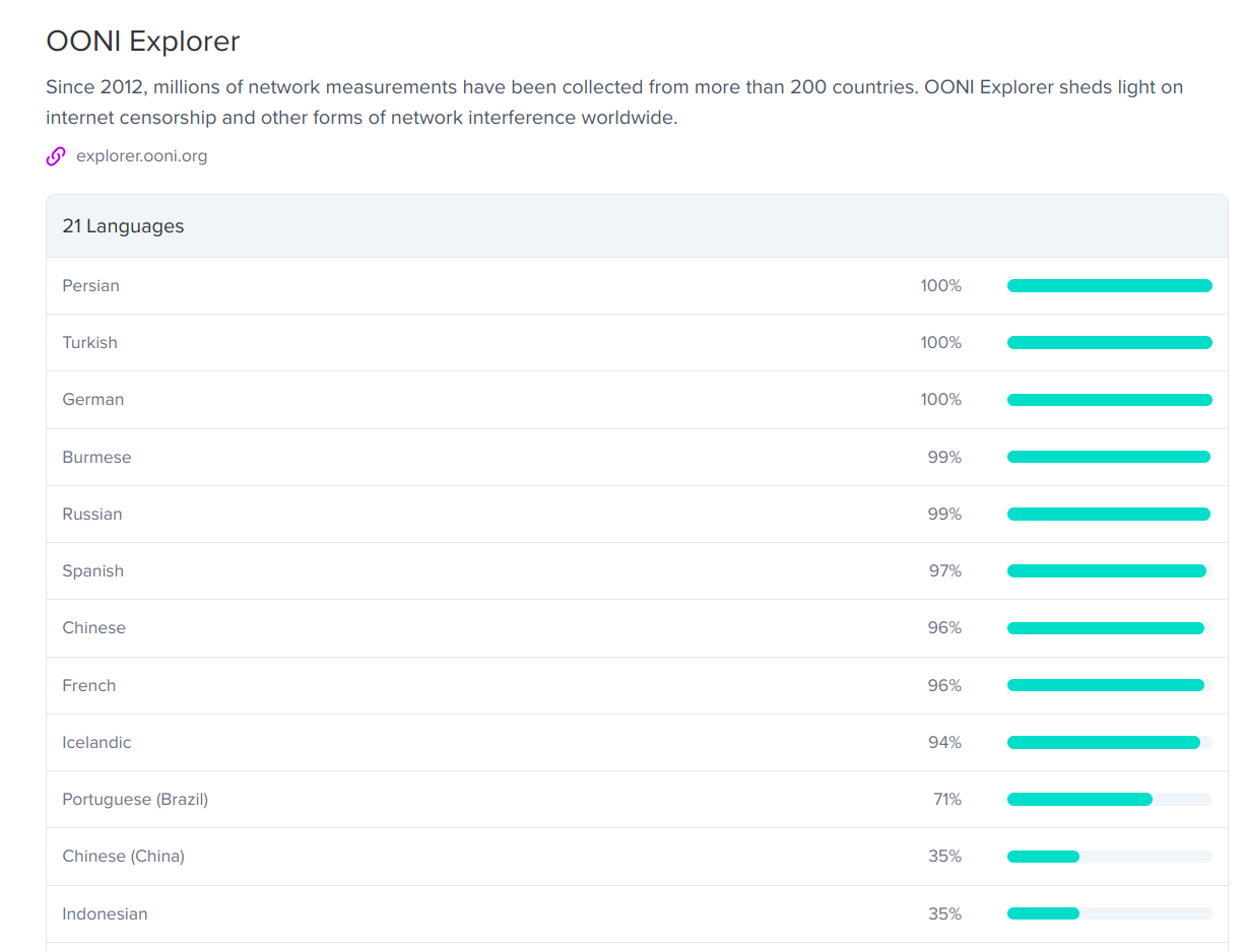 In 2022, OONI Explorer copy was uploaded to Transifex to enable its translation by the Localization Lab community, who worked towards translating the platform in 21 languages. OONI Explorer has already been translated to Farsi, Turkish, Russian, Burmese, Spanish, and Chinese, among other languages. To support translation efforts, we published new OONI Explorer localization guidelines.