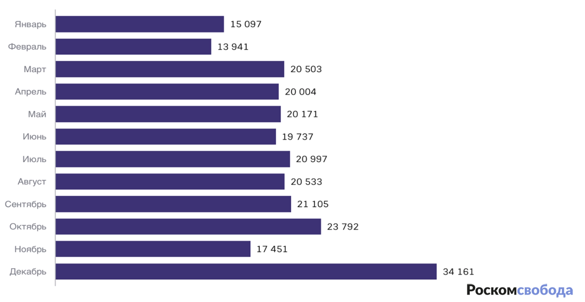 График: Новые записи, добавленные в реестр запрещенных сайтов, который ведет Роскомнадзор в 2022 году (распределены по месяцам).
