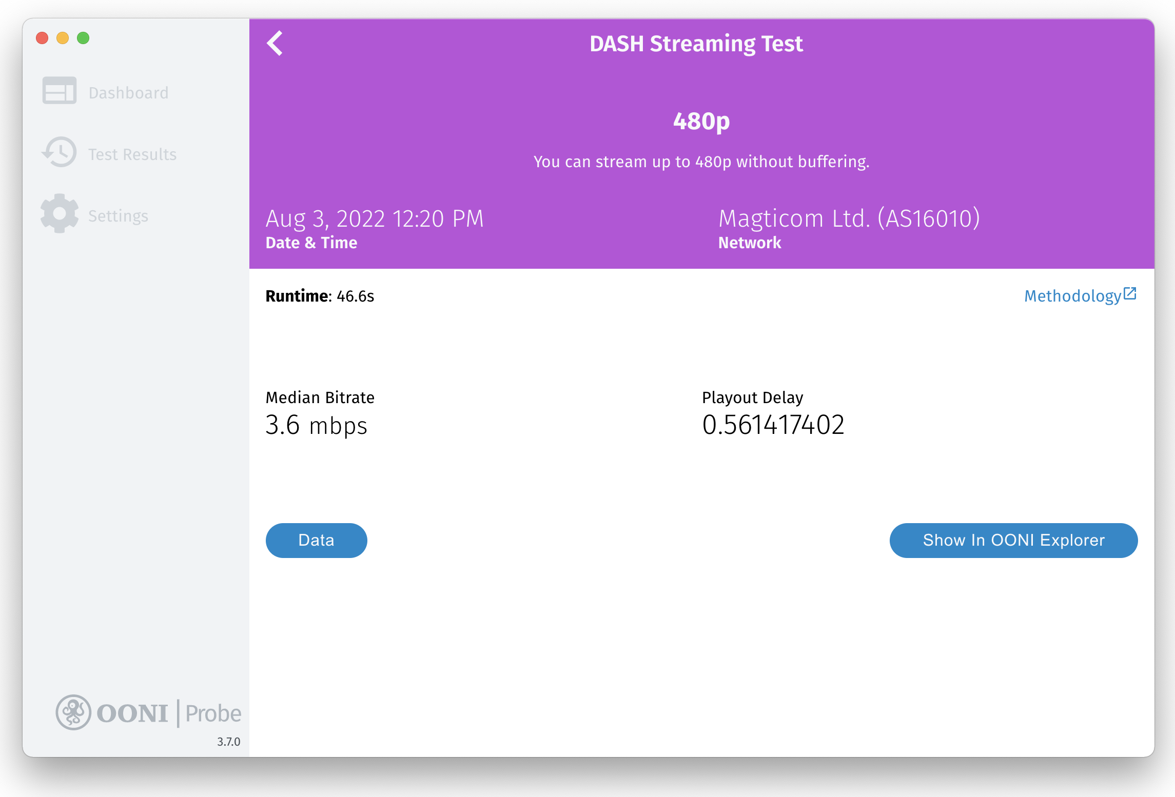 In this case, we can see that a DASH video streaming test was run on Magticom Ltd. (AS16010) on 3rd August 2022 at 12:21 local time. When the test was performed, it was possible to stream up to 480p video without buffering, with the median bitrate being 3.6 megabits per second. This indicates that the user could only stream low definition videos on that network if the streaming server was co-located with the measurement server.
