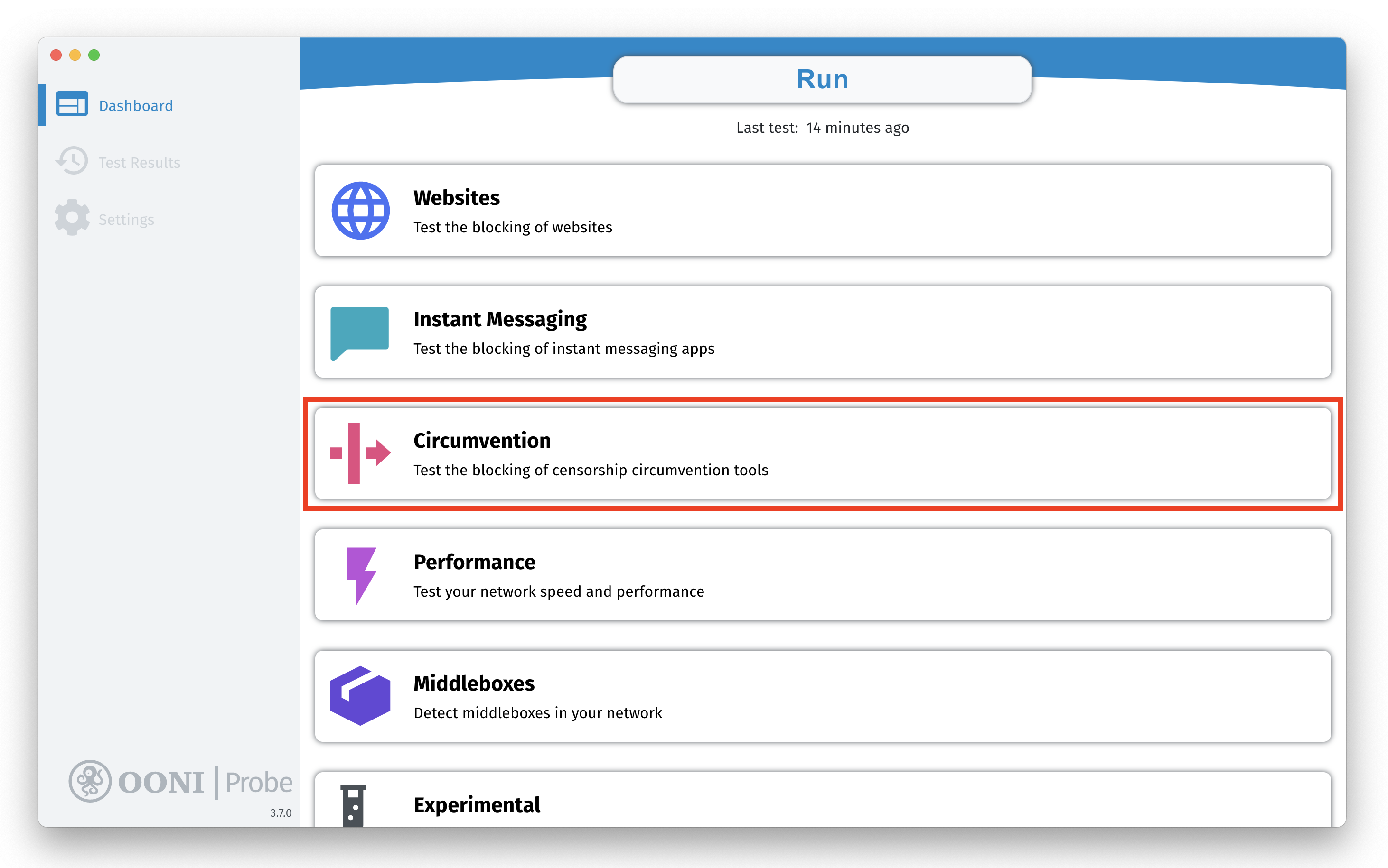 Step 1. Click Circumvention in the Test Results screen of your OONI Probe desktop app.