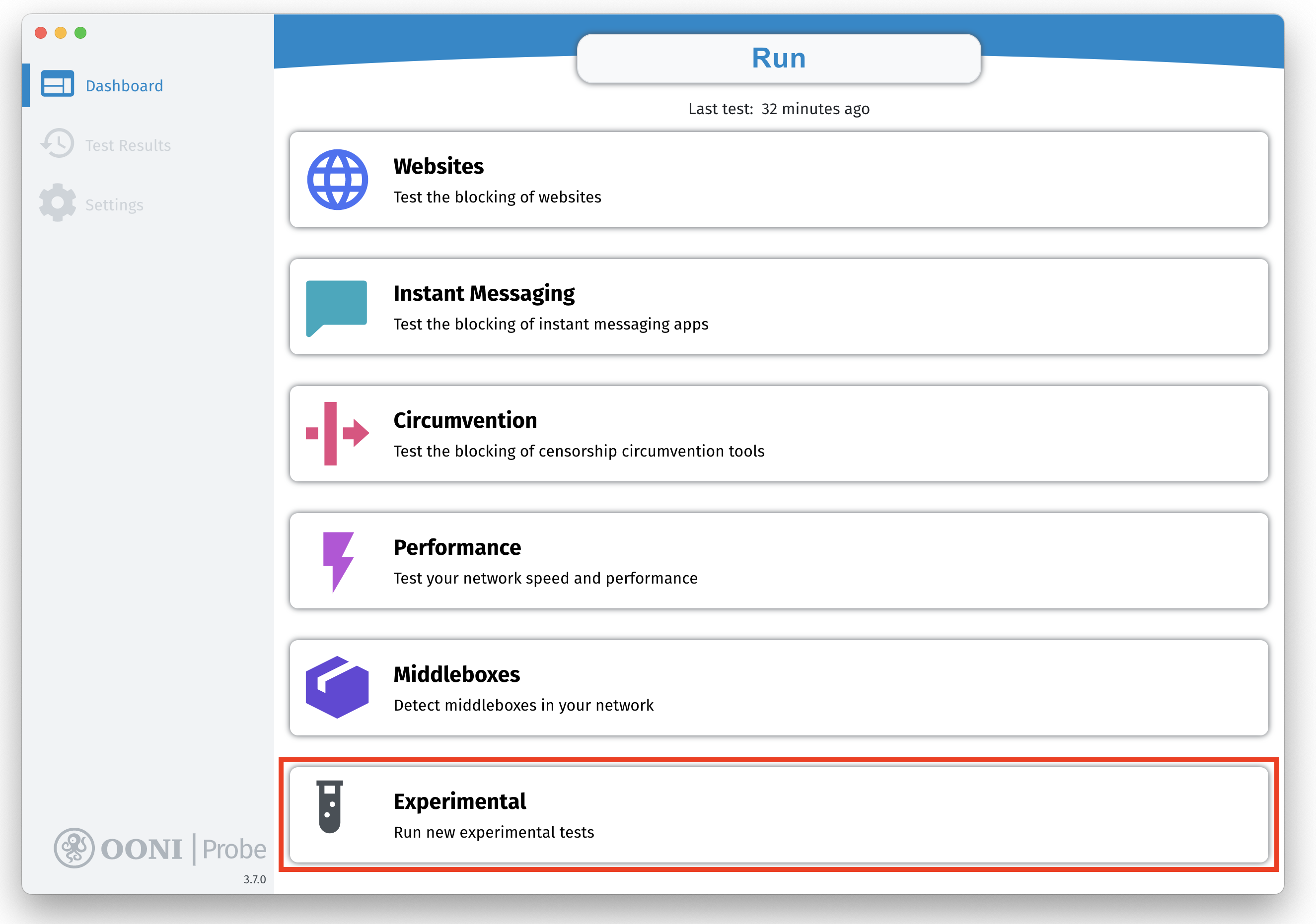 - Experimental card. Includes multiple new experimental tests developed by the OONI team. These tests might change over time. You can view these tests here.