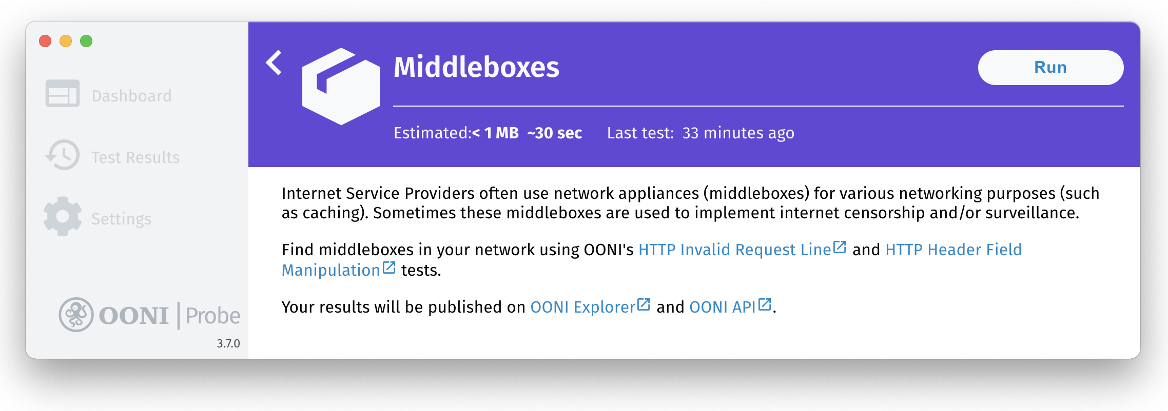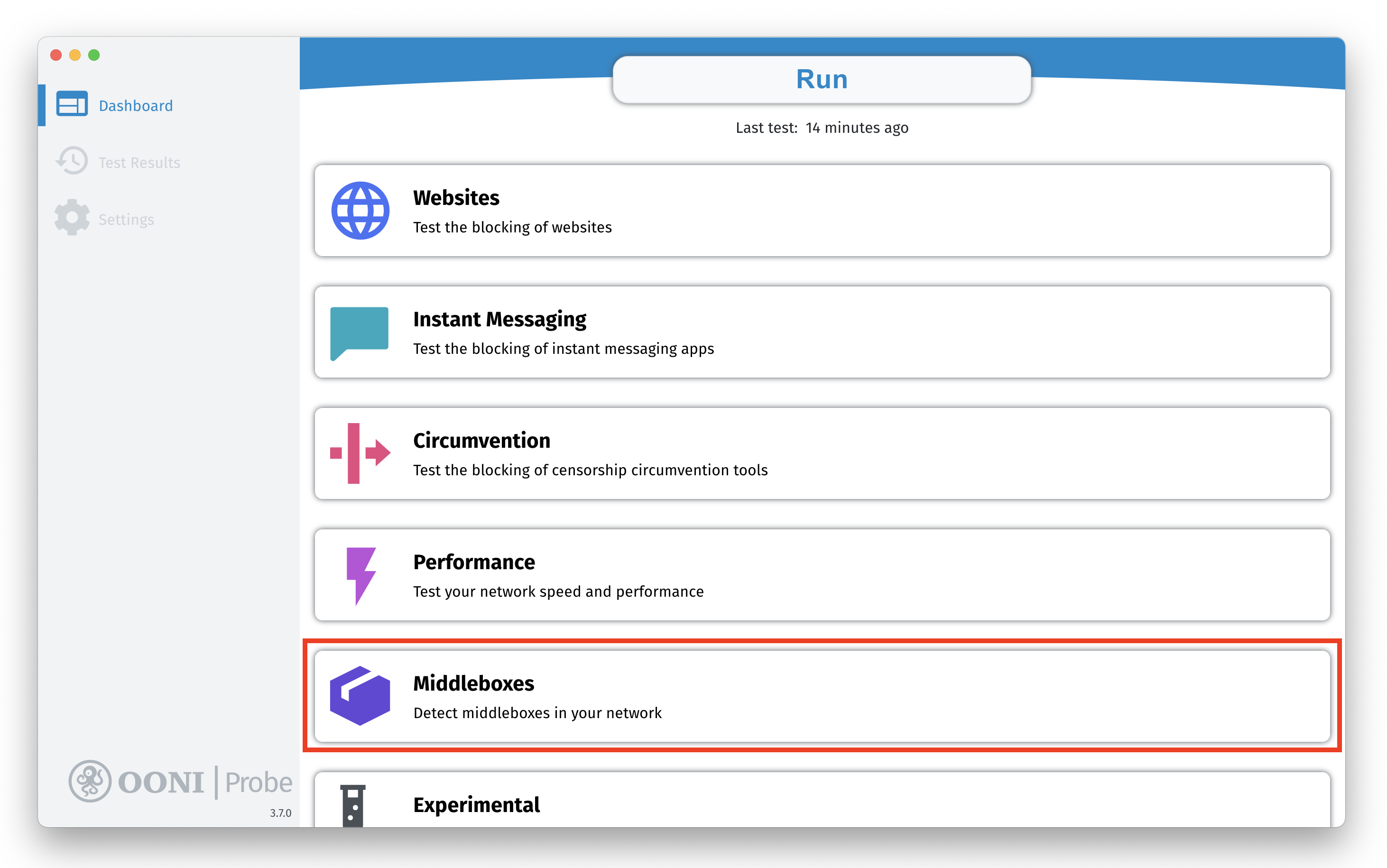 Step 1. Click Middleboxes in the Test Results screen of your OONI Probe desktop app.
