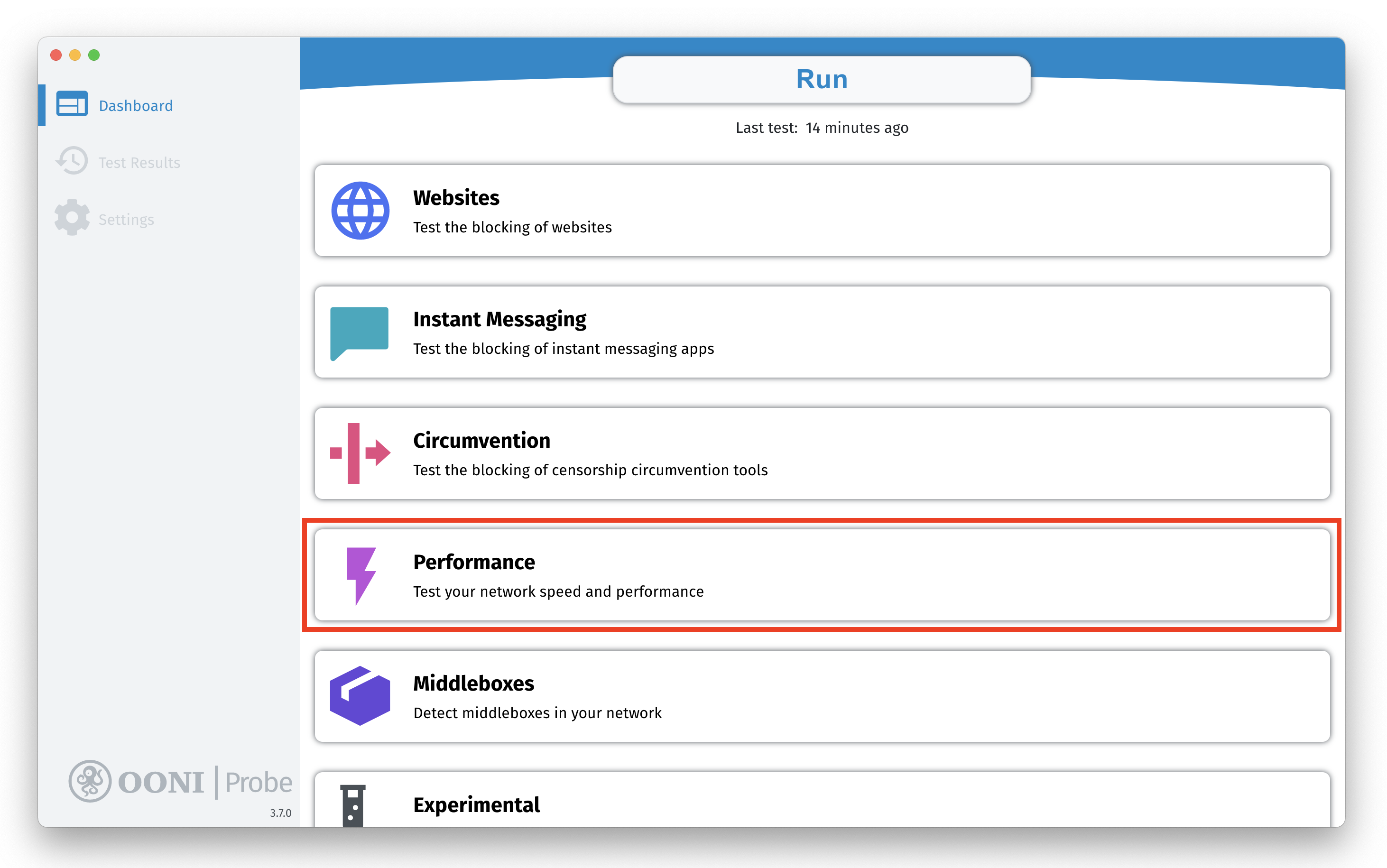 Step 1. Click Performance in the Test Results screen of your OONI Probe desktop app.