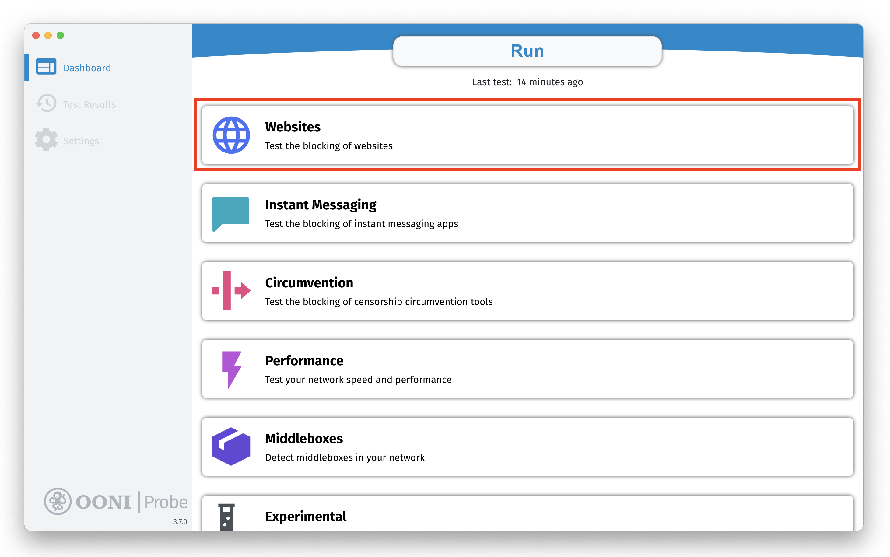 Step 1. Click the Websites card in the Dashboard of your OONI Probe desktop app.