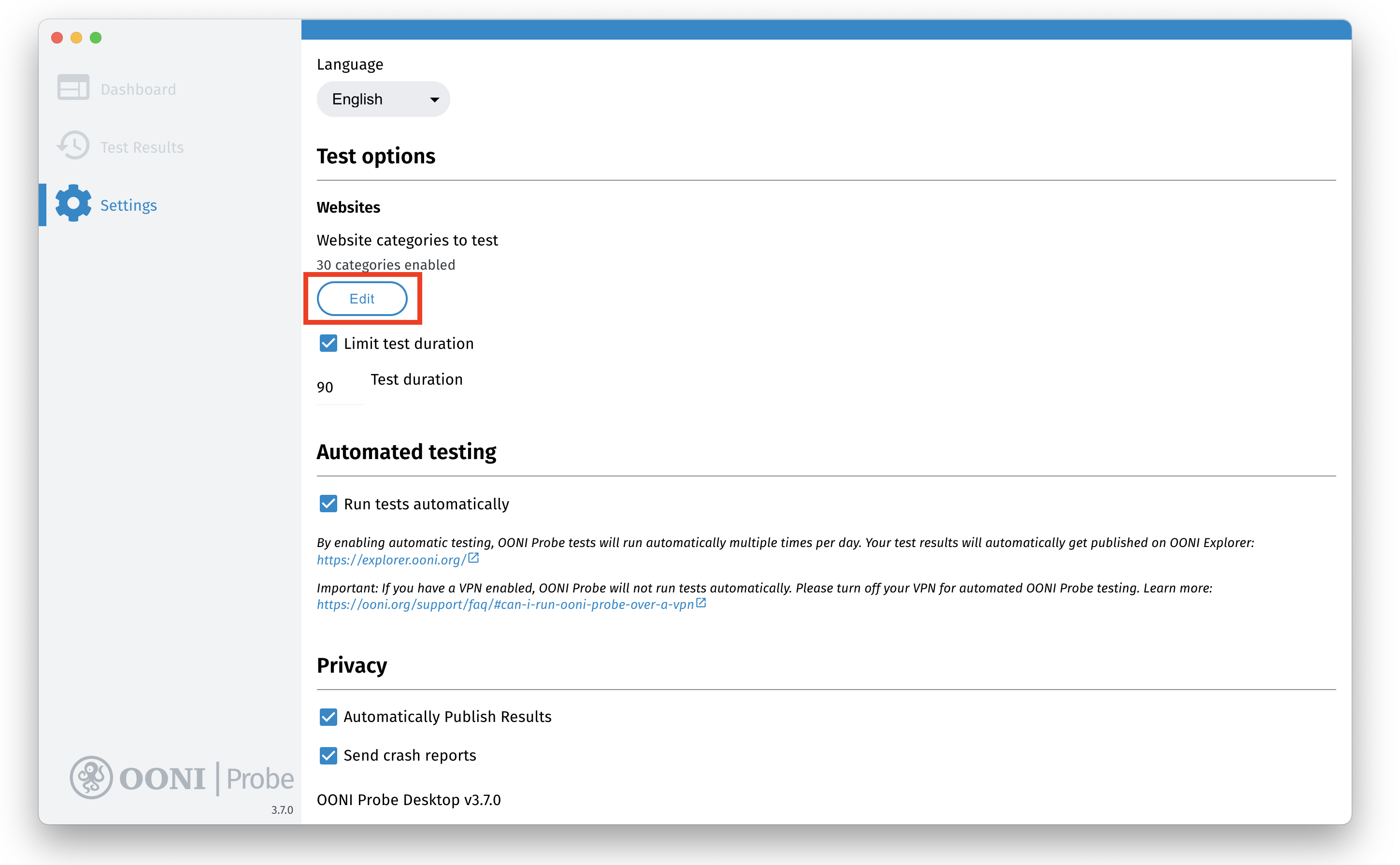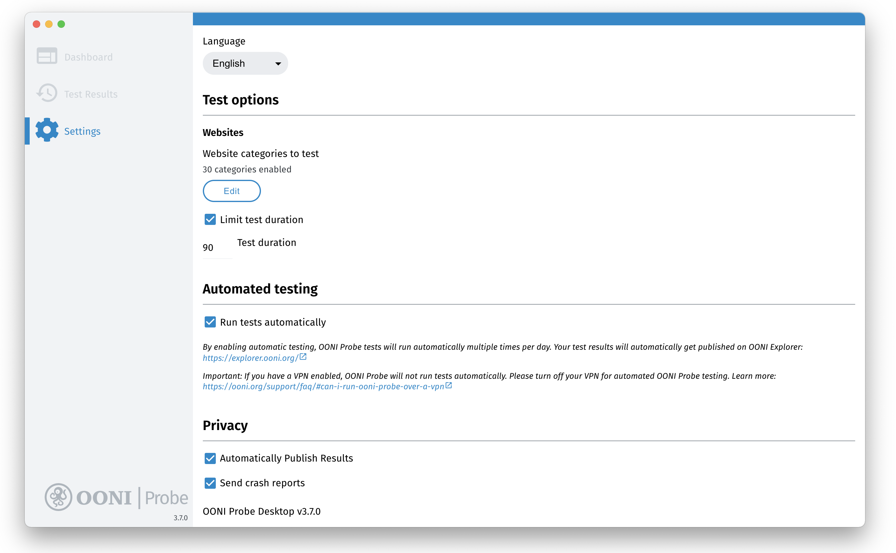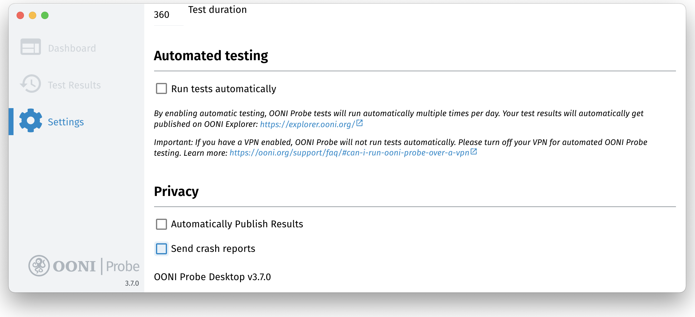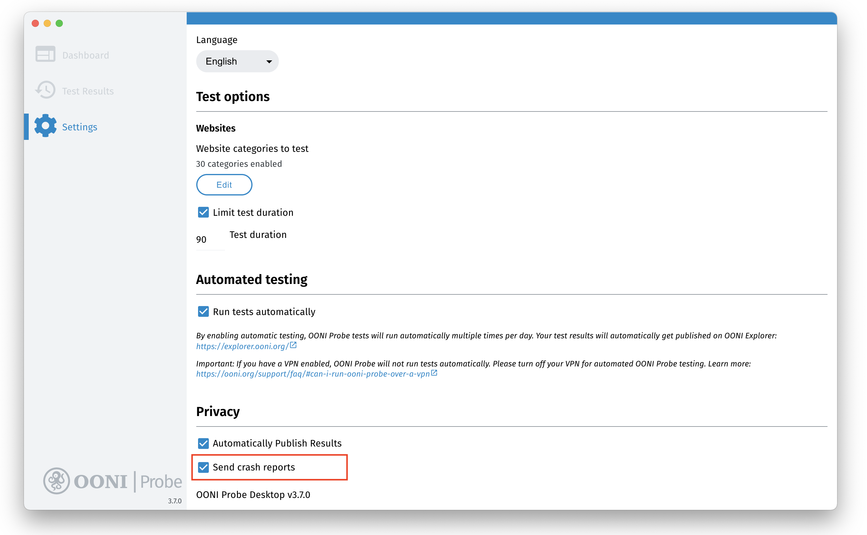 By default, the automatic publication of your OONI Probe test results is enabled, while the submission of crash reports is disabled (unless you opted-in during the onboarding).