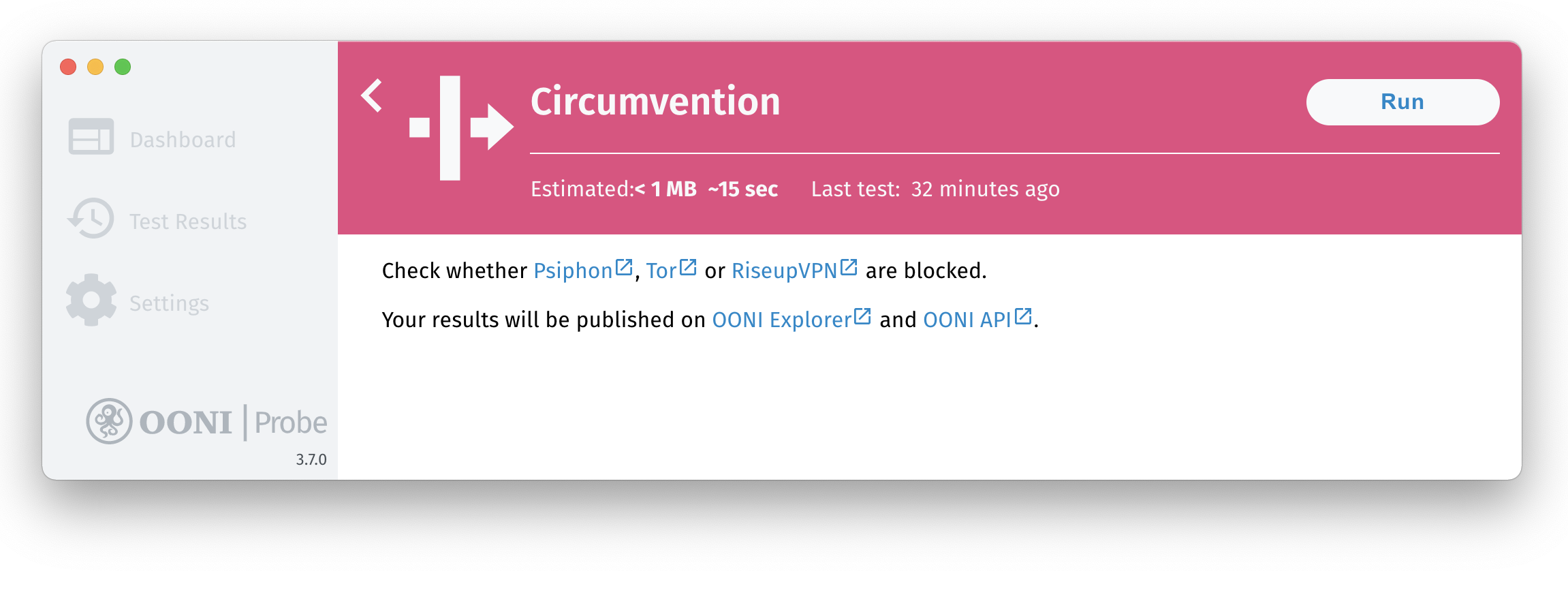 In the top header, we share an overview of your circumvention tool testing results. Next to each tested tool, there will either be a green tick (indicating reachability), or a red cross (indicating potential blocking).