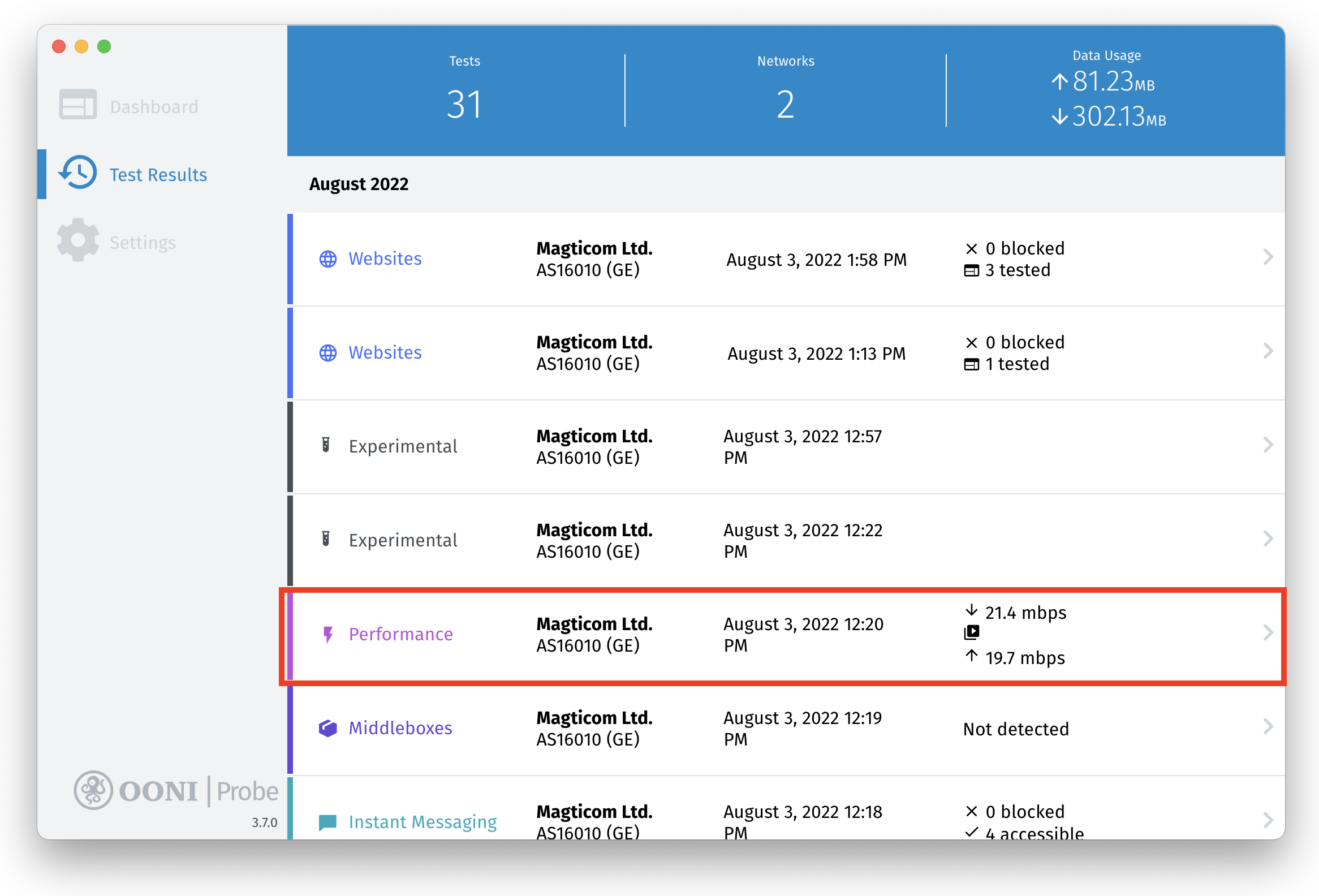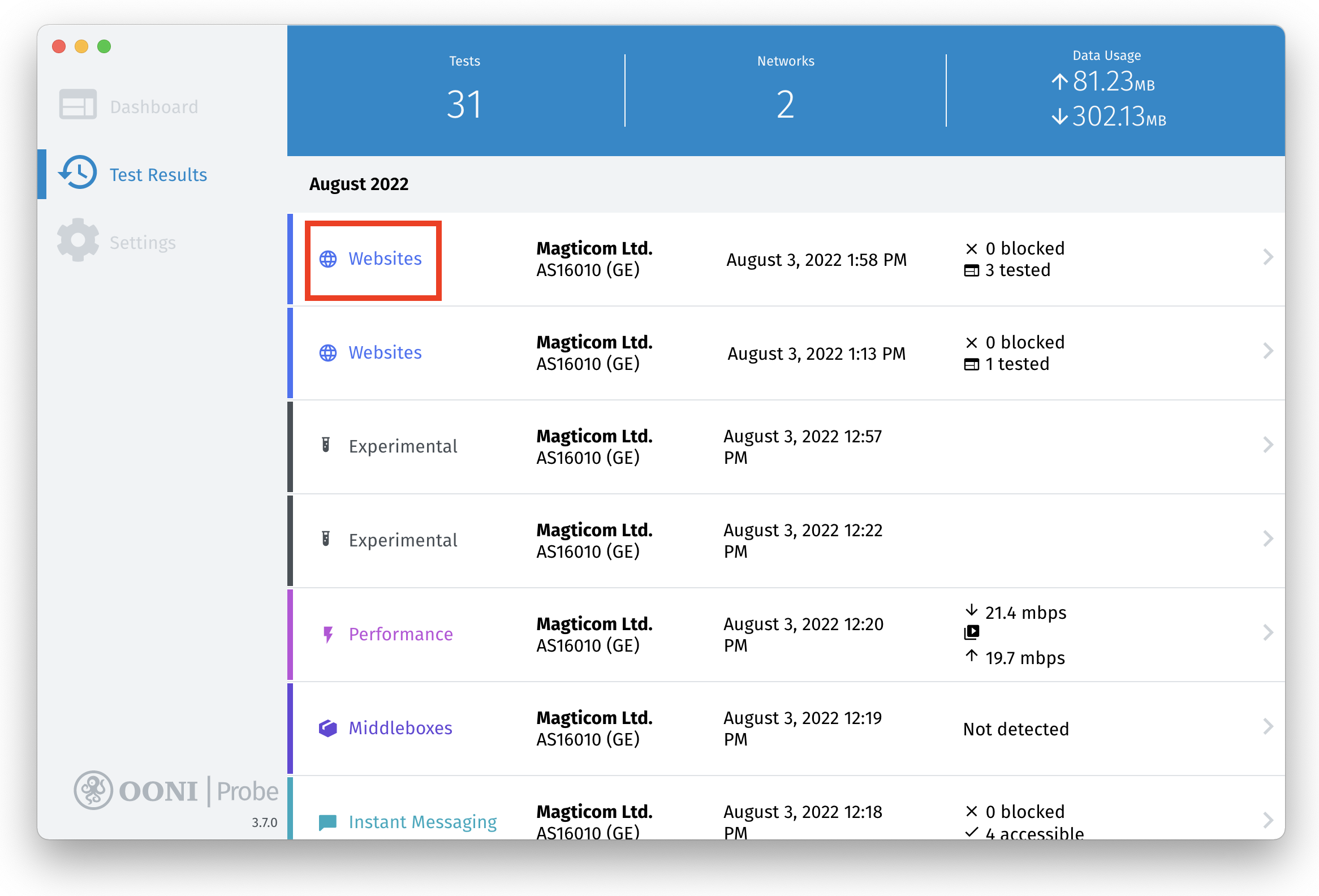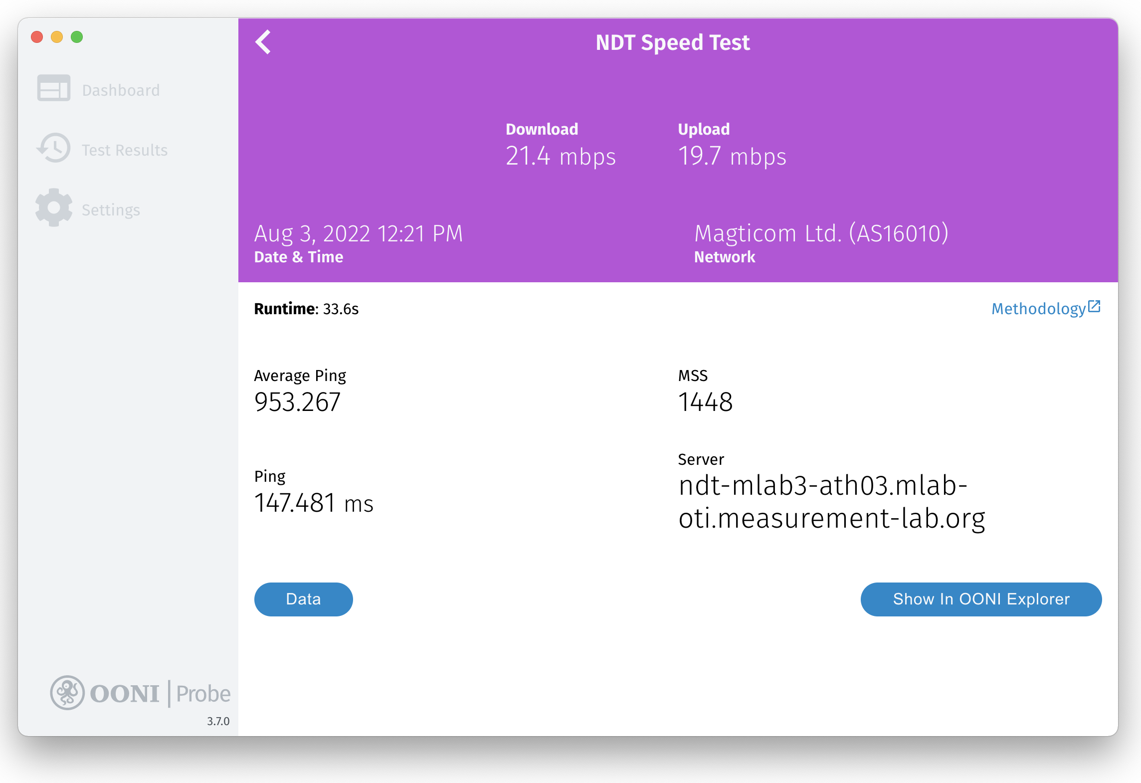 for Magticom Ltd.); - Network measurement data (which depends on the OONI Probe test).