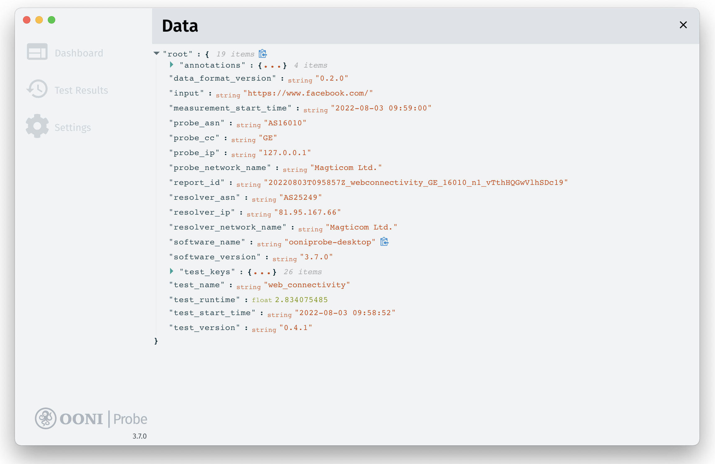 You now have access to the raw measurement data pertaining to the OONI Probe test result you selected.