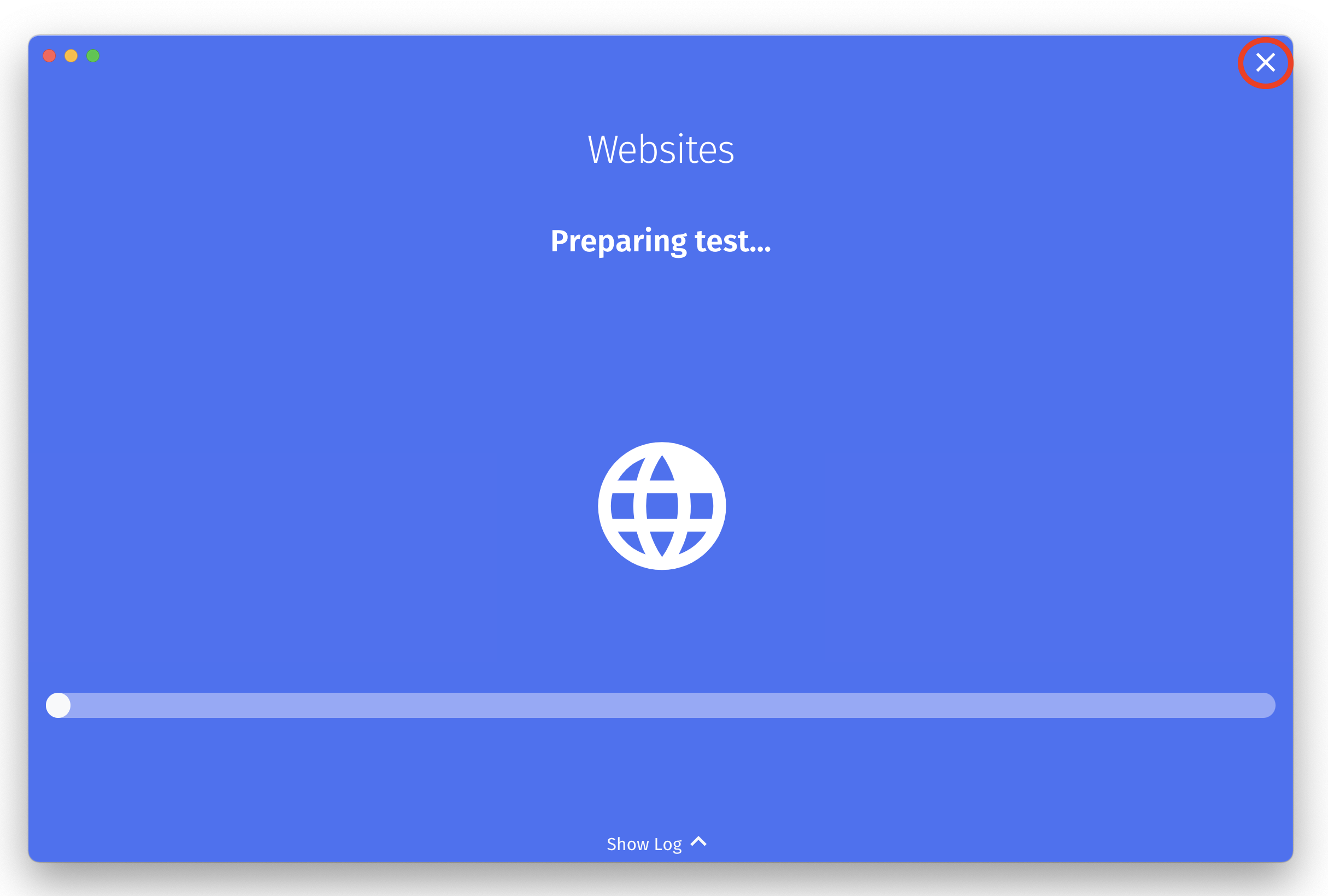 OONI Probe should have run all tests within a few minutes (though this depends on the performance of the network you’re connected to, and may take longer in some cases). If the performance of your network is not good enough and the tests take too long, you can stop the ongoing test by clicking the cross button in the top right corner.