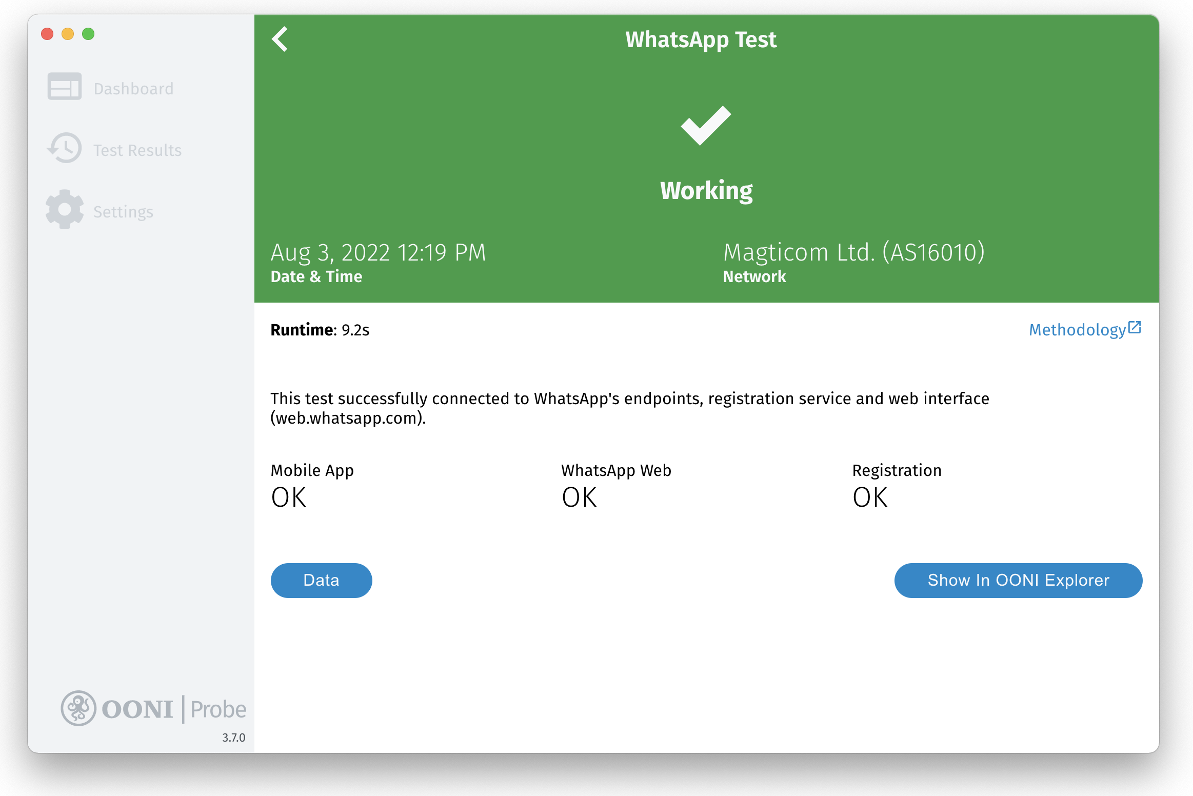 In this case, we can see that Telegram was found accessible when tested on Magticom Ltd. (AS16010) on 3rd August 2022 at 12:19 local time. This conclusion is reached because OONI’s Telegram test was able to successfully connect to Telegram’s endpoints and web interface (web.telegram.org