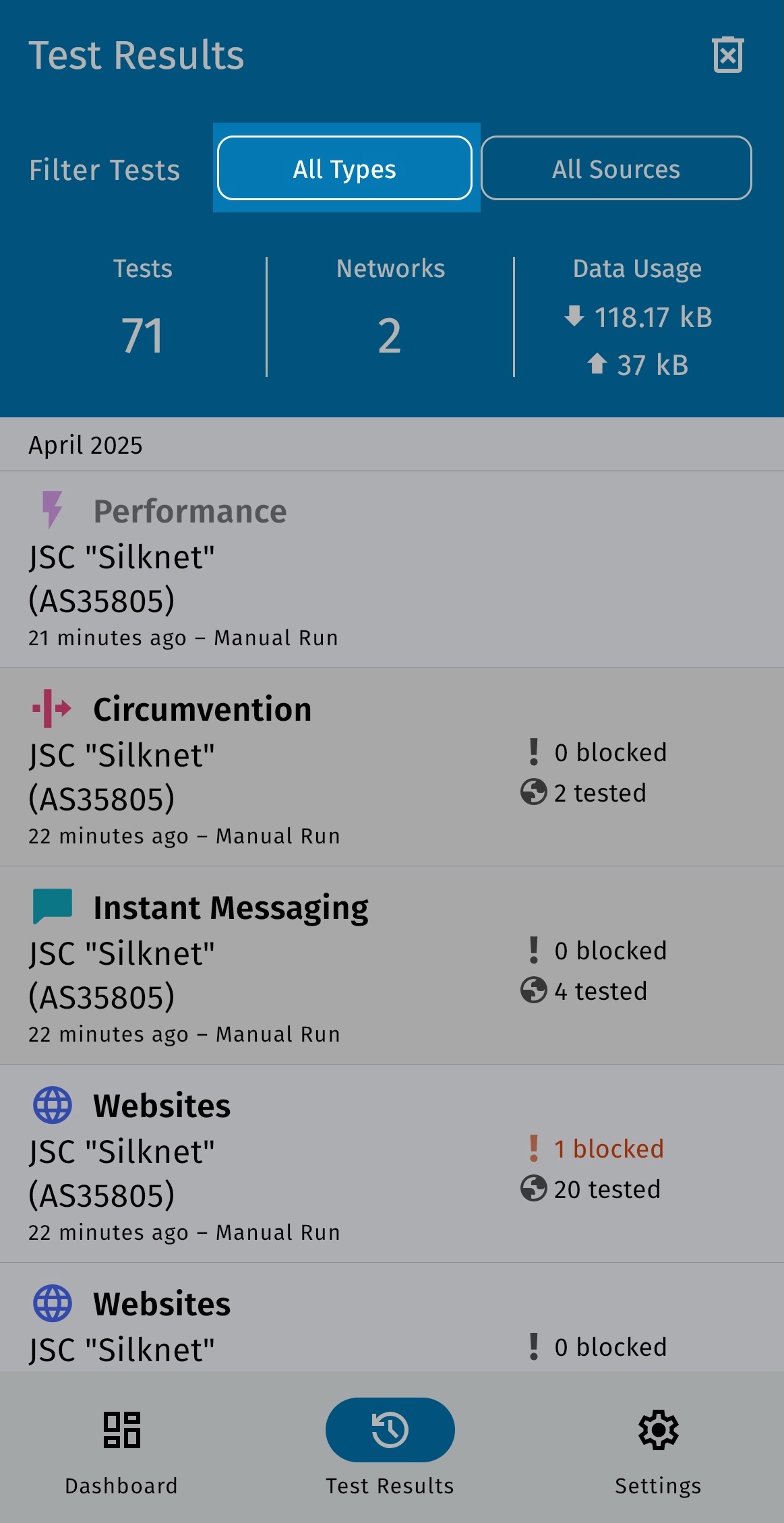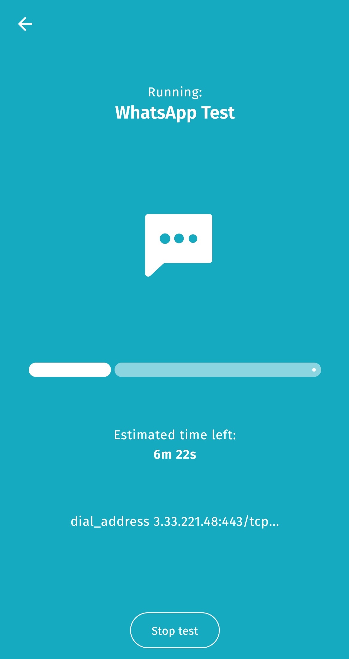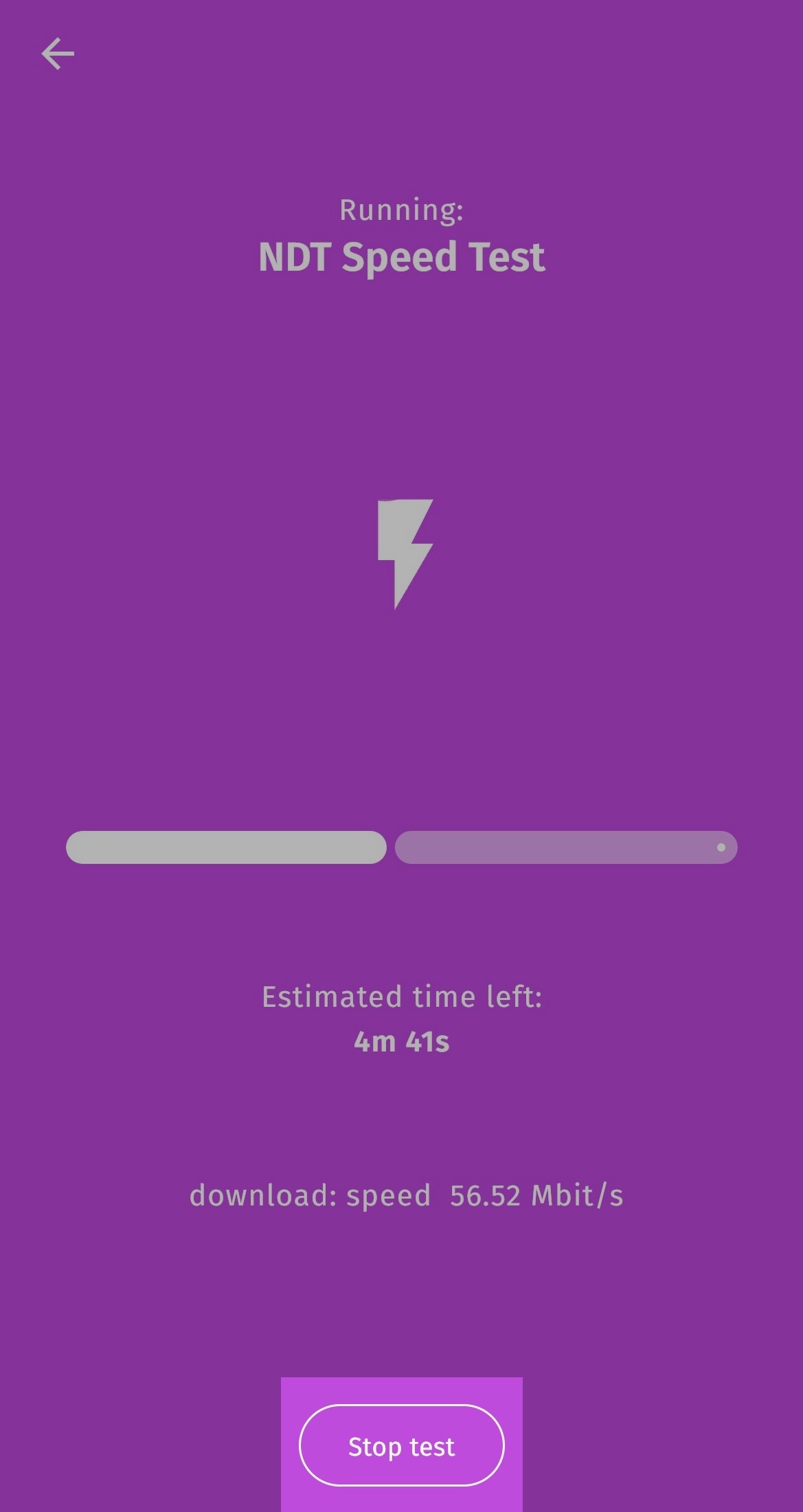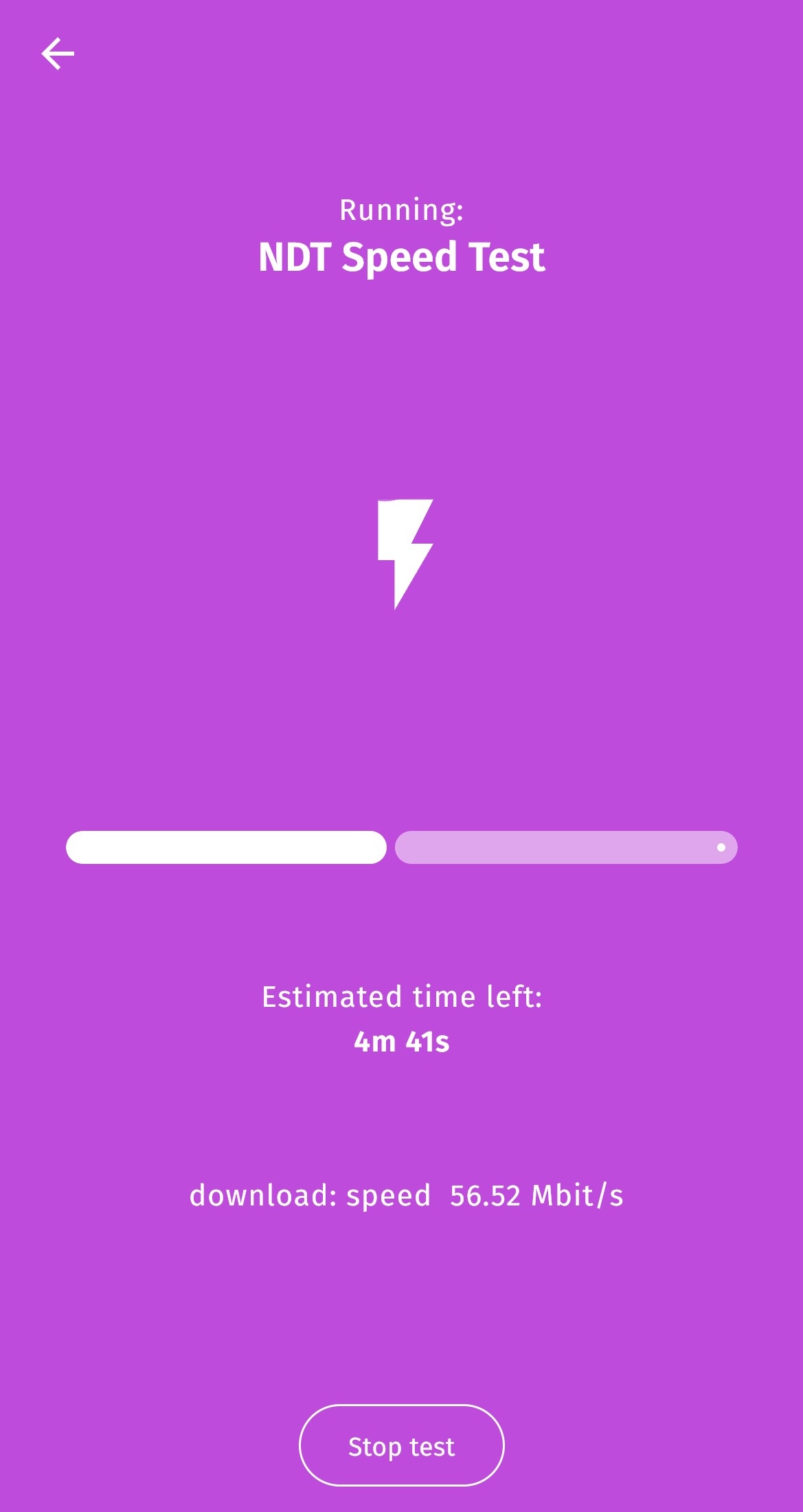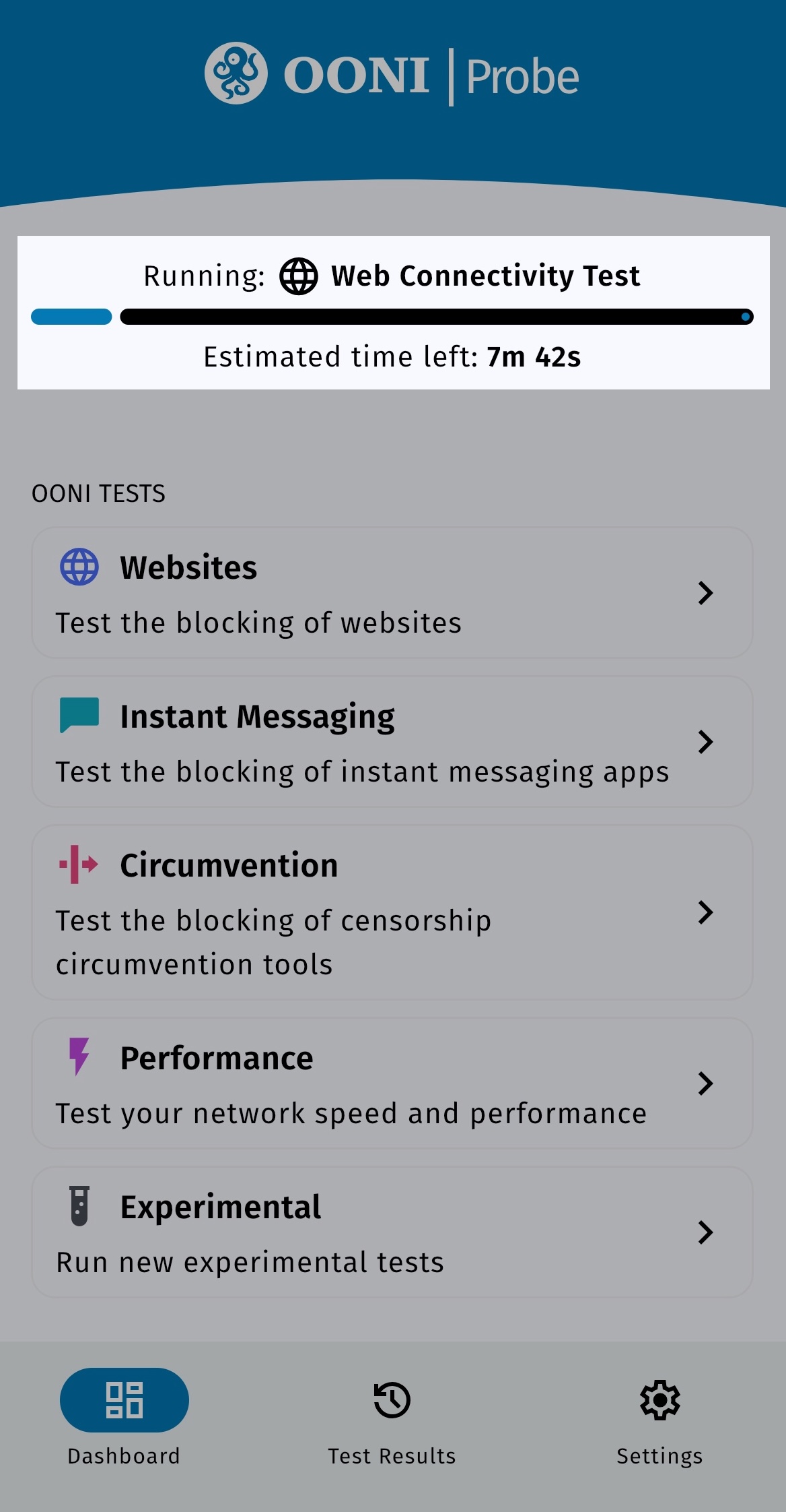 OONI Probe should have run all tests within a few minutes (though this depends on the performance of the network you’re connected to, and may take longer in some cases). If the performance of your network is not good enough and the tests take too long, you can stop the ongoing test by tapping the Stop test button.