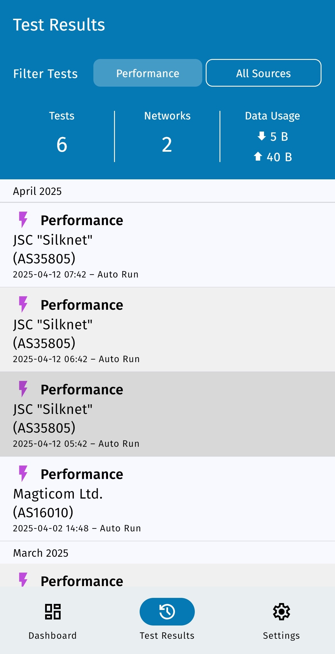 In the top header, we share an overview of your performance testing results: the number of tests run from your device, number of tested networks, amount data used for the testing of your network’s performance.