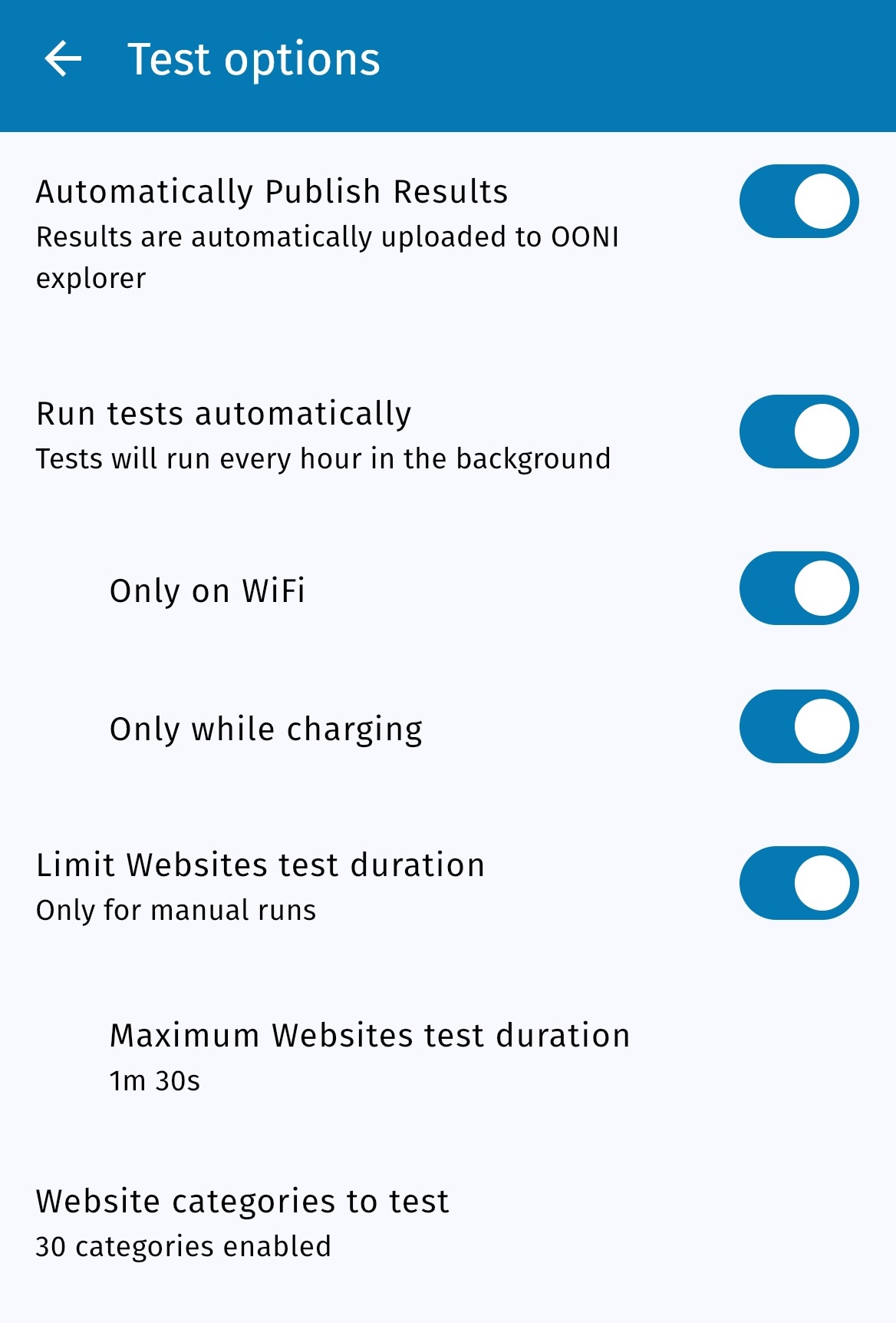 Your OONI Probe test results will automatically get published on OONI Explorer and on the OONI API. You can opt out from publishing the results in the “Test options” settings of your app.