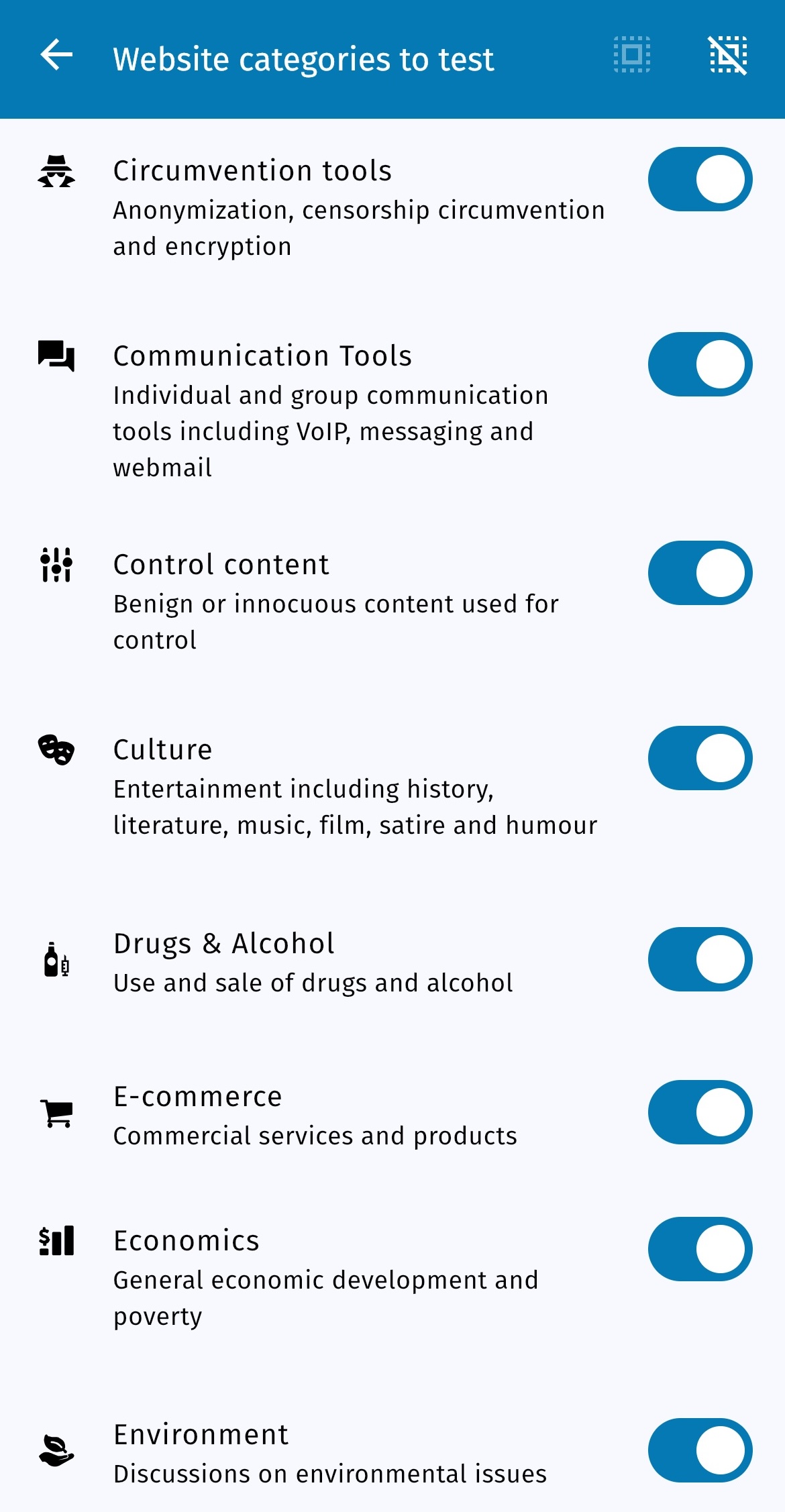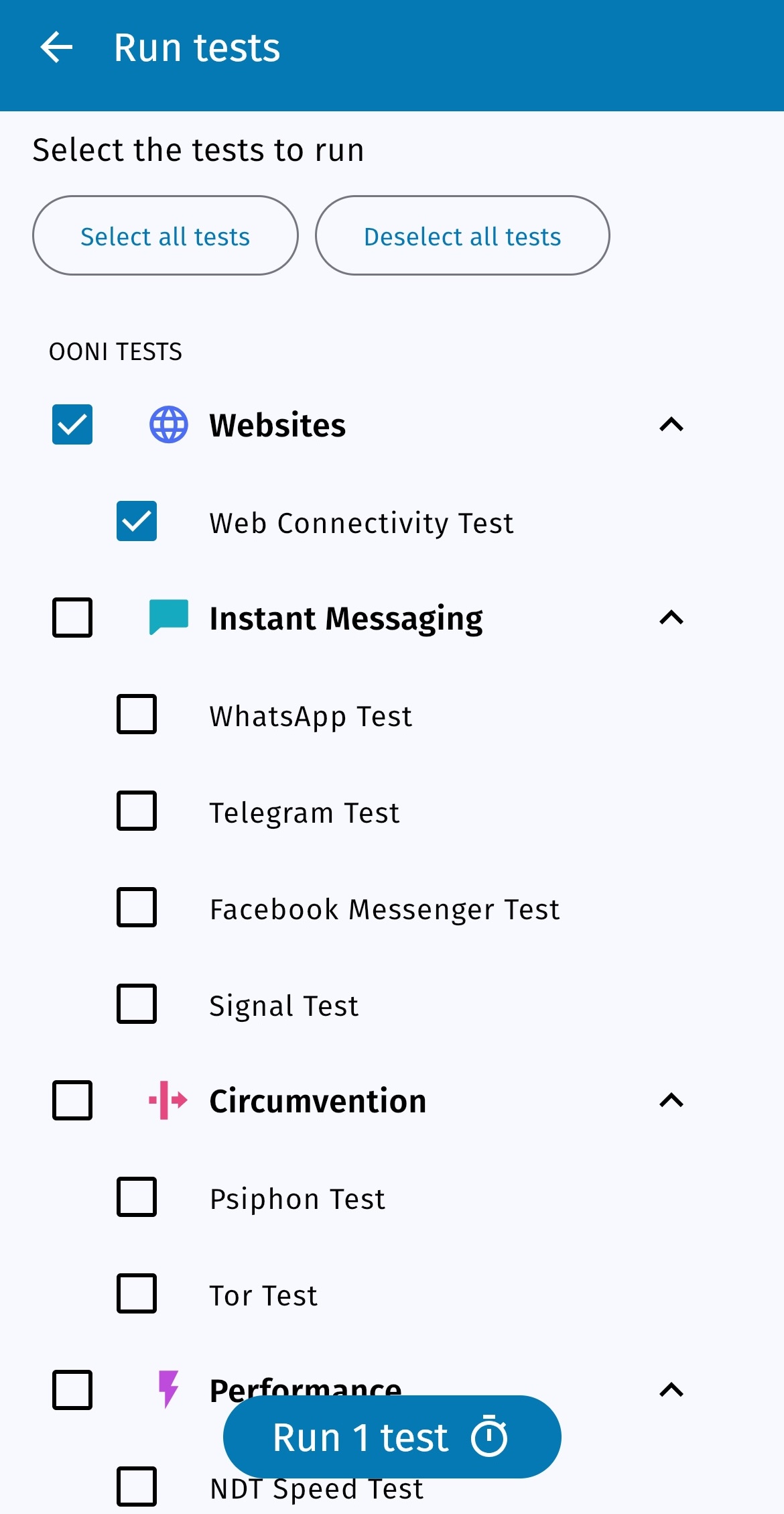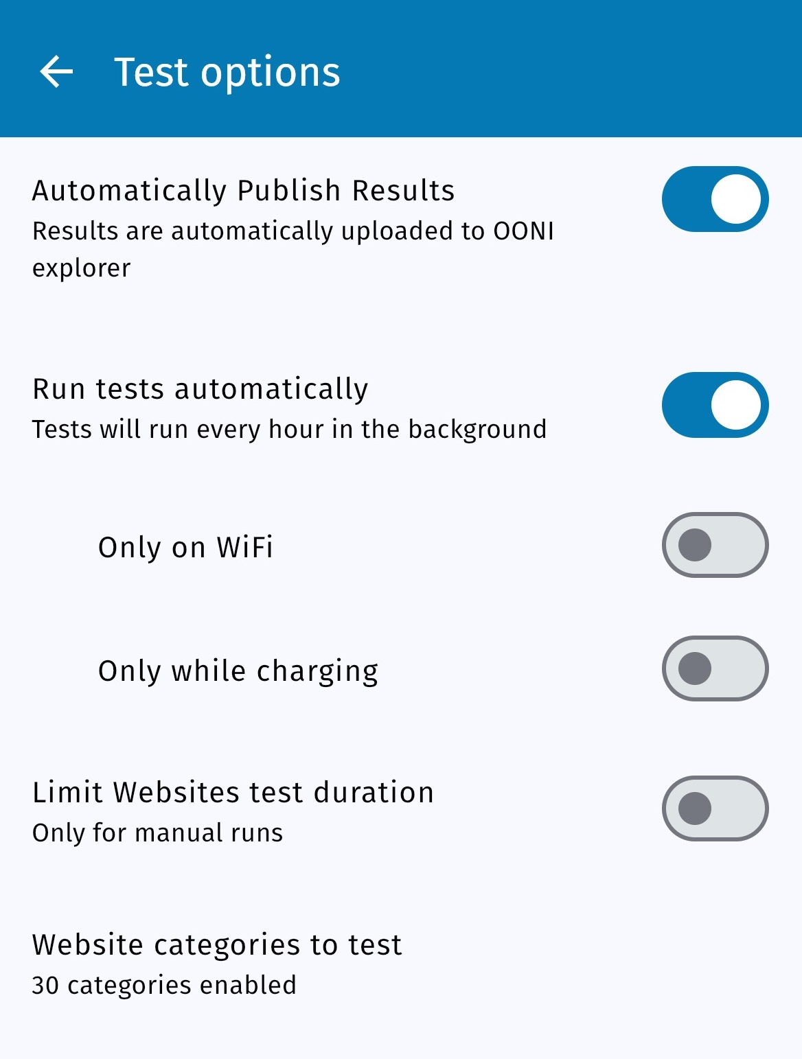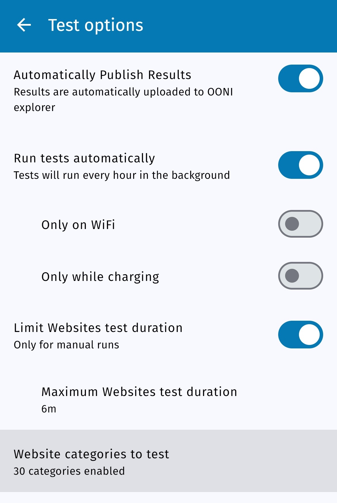 With automated OONI Probe testing, you can regularly contribute censorship measurements (without having to do anything), enabling the internet freedom community to monitor and detect censorship events in your country over time. If you are concerned about traffic consumption or risks connected with regular testing of specific websites categories, you can limit the types of tests to be ran through the Run menu or limit list of categories to be tested through Test options section of OONI Probe settings. You can also limit types of tests to be run automatically through the Dashboard menu of the app.